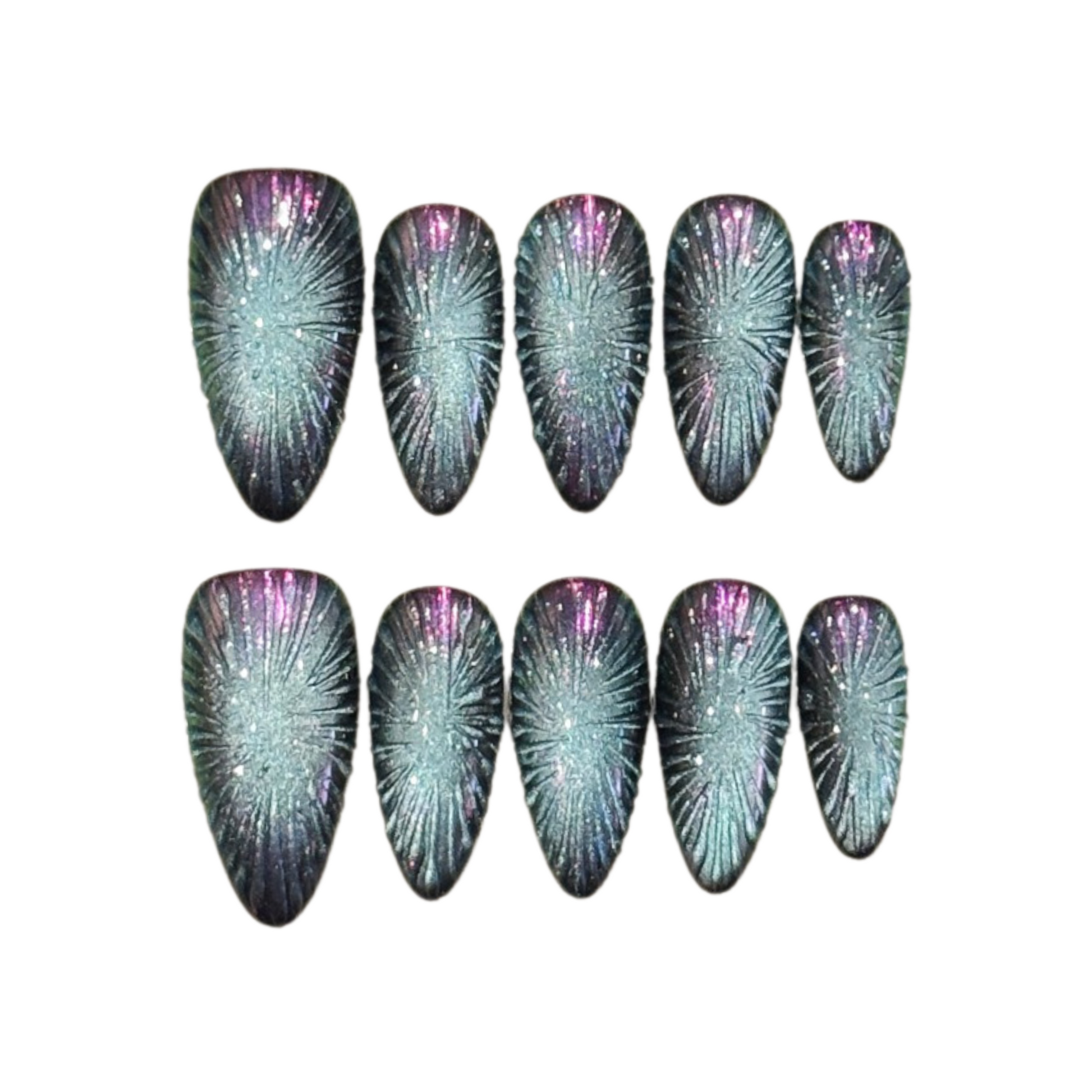 • 10 handmade press-on nails, stored in a clear protective case