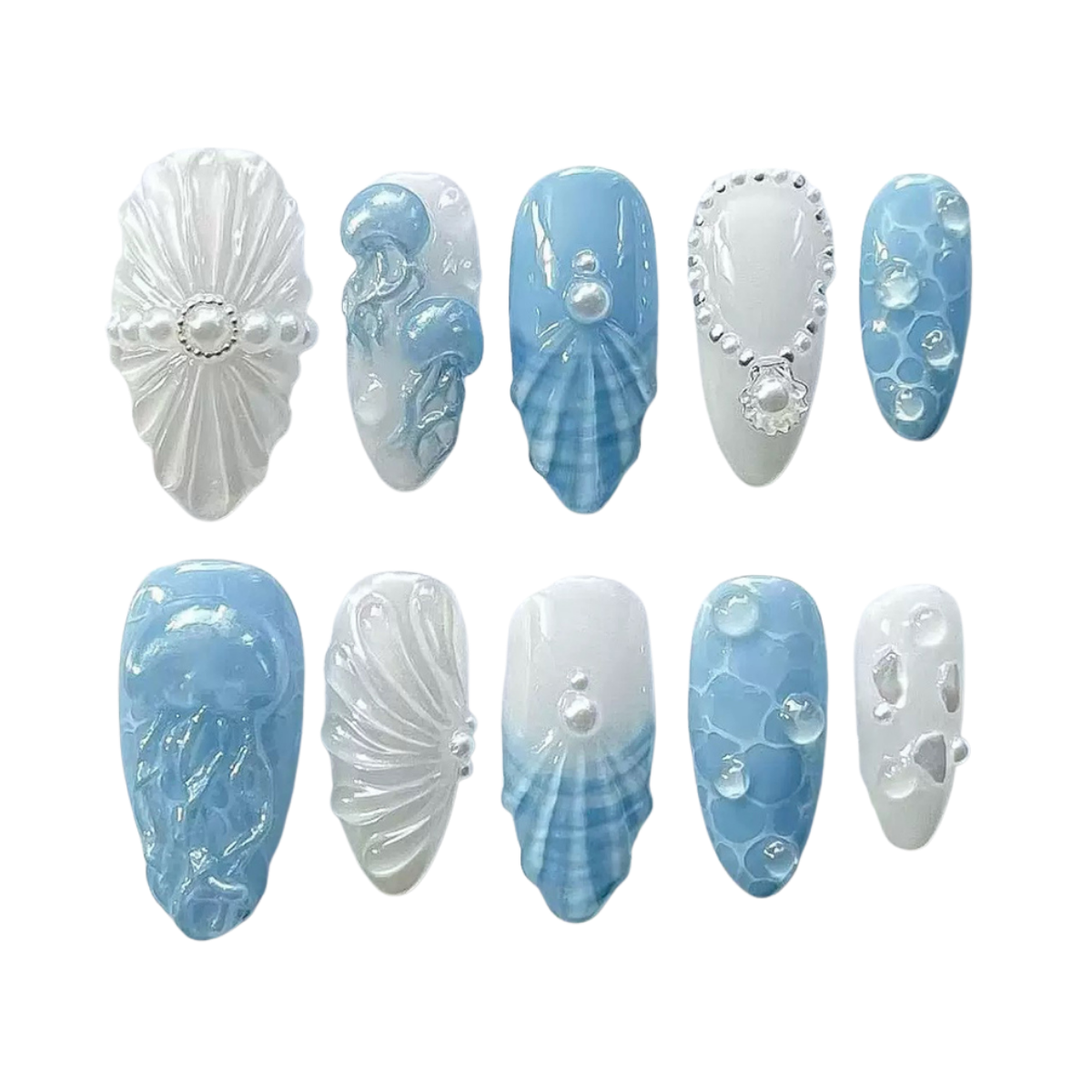 A serene ocean fantasy where pearly whites meet tranquil lagoon blues, adorned with seashell textures, jellyfish motifs, and shimmering bubbles for a truly ethereal touch.
