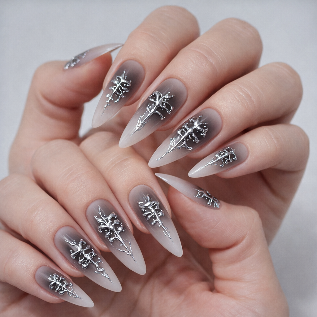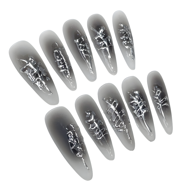 Designed for edgy nights out or futuristic-themed events, these nails feature a smoky gradient with metallic 3D elements that give off an otherworldly vibe
