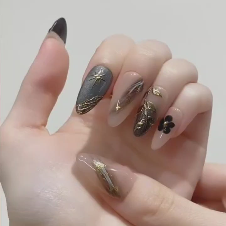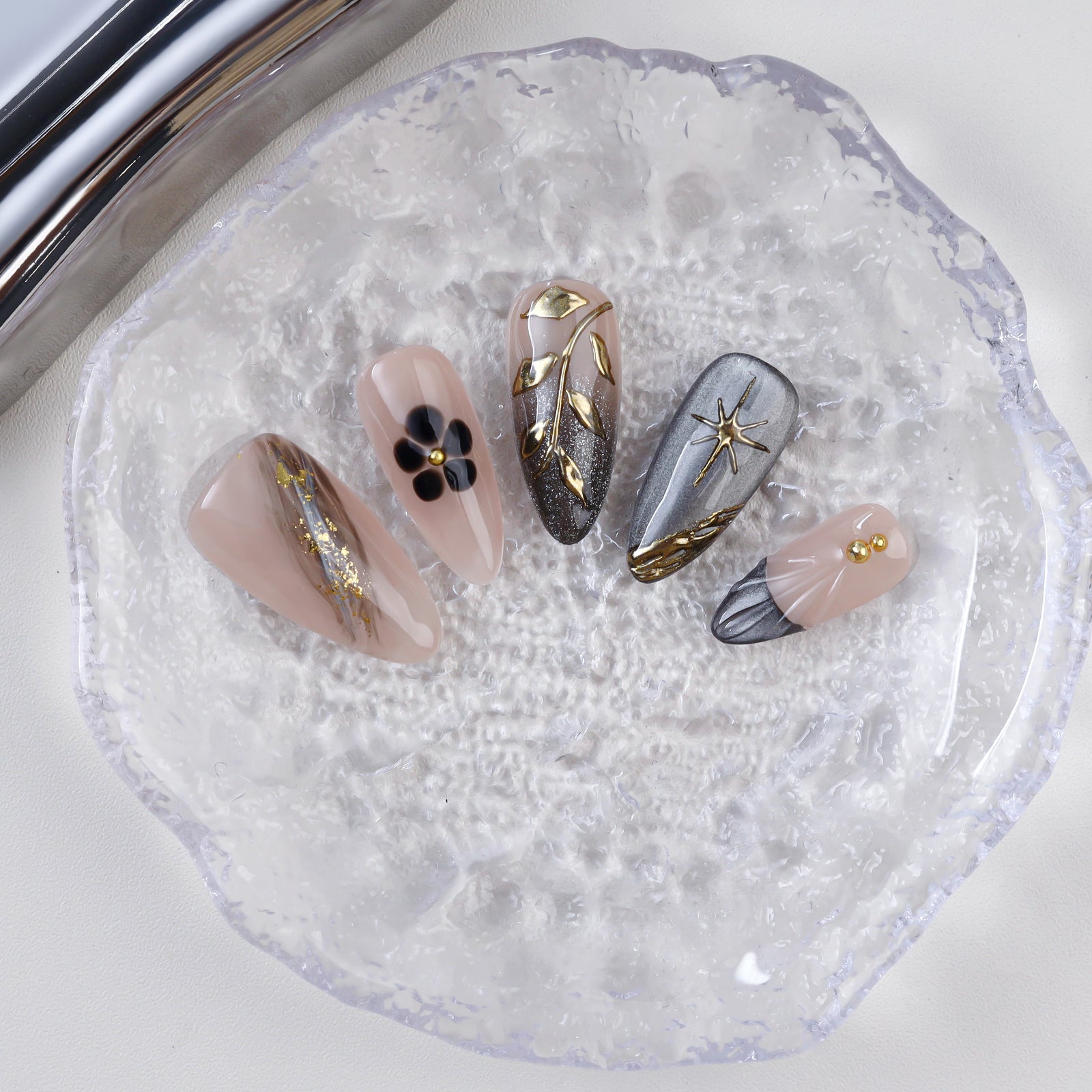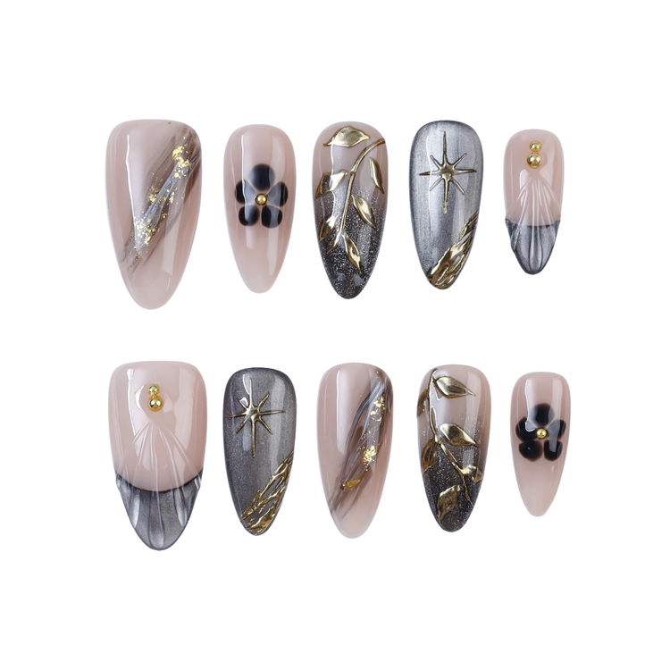 A luxurious blend of taupe and charcoal tones with gold accents - capturing the mysterious glow of a starry night wrapped in elegance and depth.