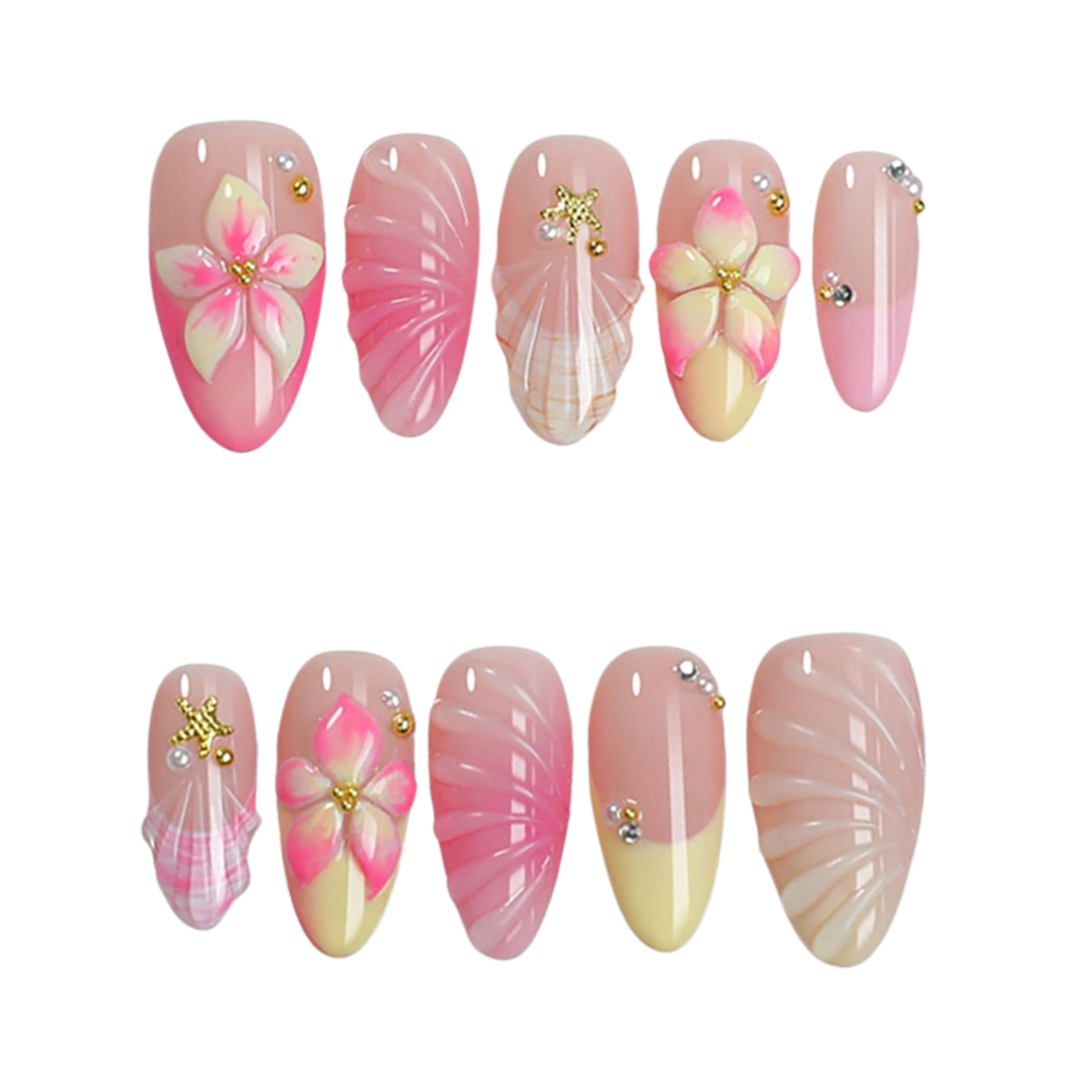 Bold grapefruit shades with yellow accents, seashell details, and tropical flowers - a zesty, refreshing summer design.