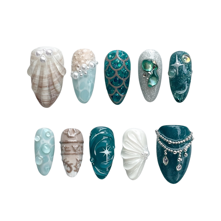 A mystical blend of teal, pearl, beige, and silver with seashell textures, pearls, and ocean-inspired details - evoking the hidden treasures of a lost city beneath the waves.