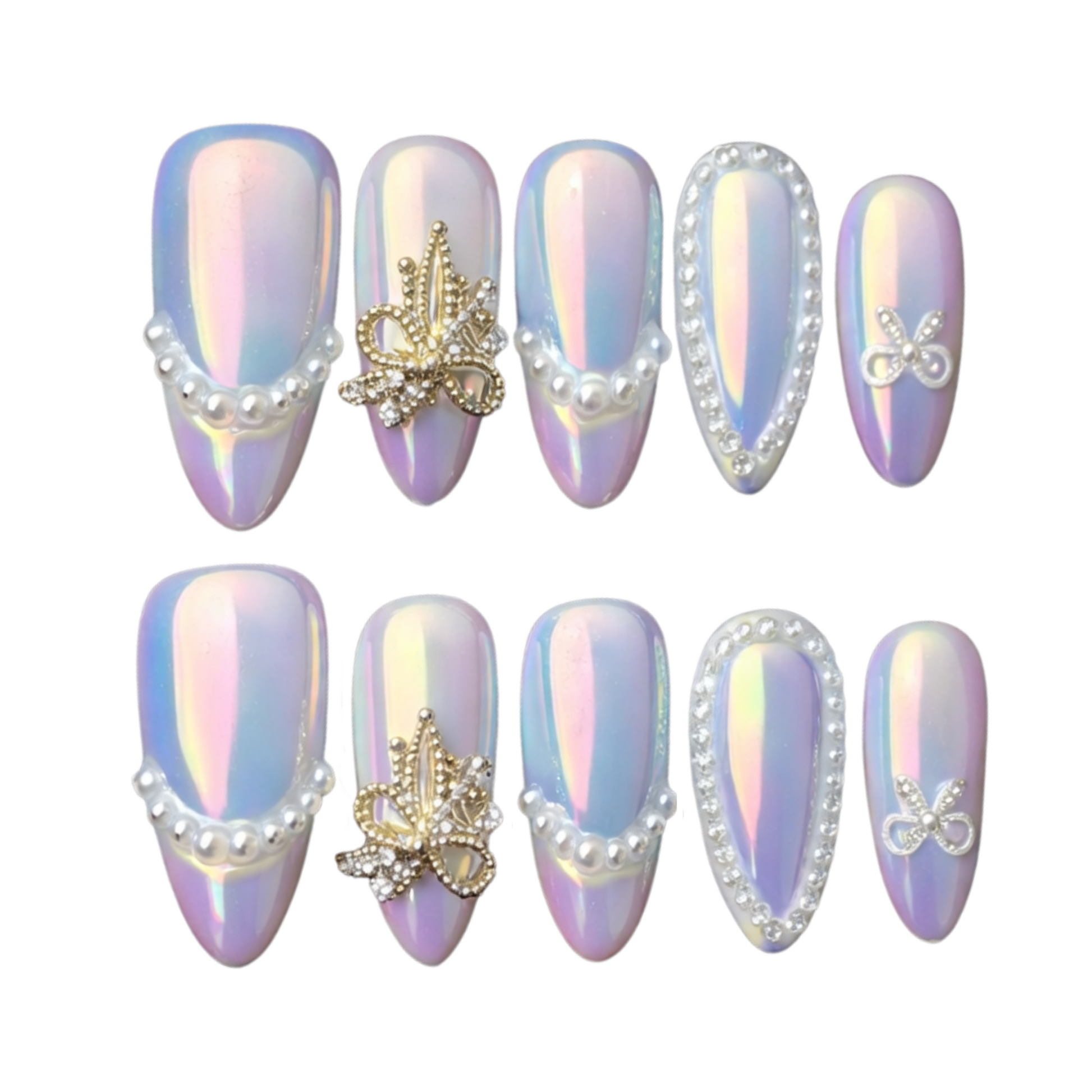 An iridescent pearl base with shifting hues of lilac, pink, and blue, adorned with pearls and golden bows details. elegant yet glamorous.