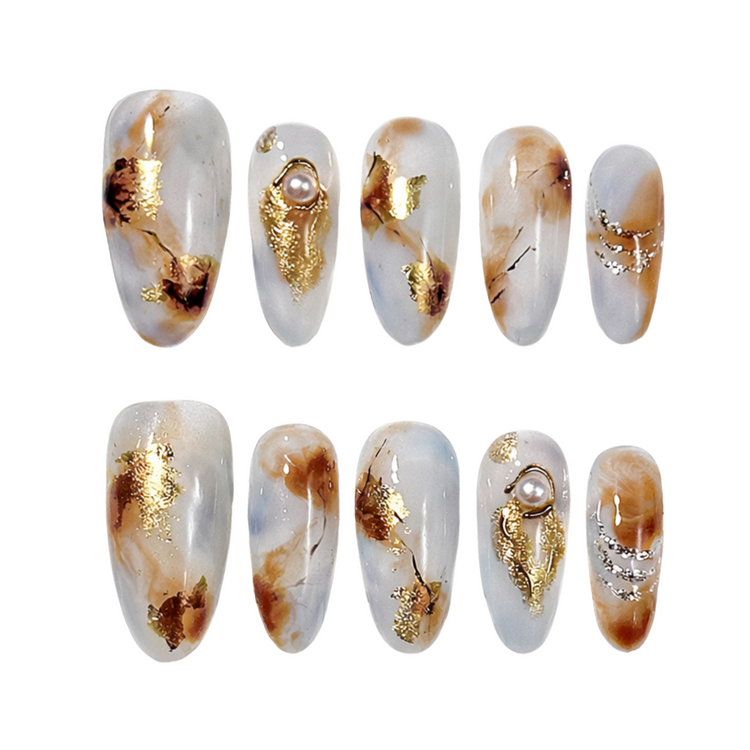 Translucent base swirled with warm browns, golden foils, and delicate pearls - like autumn leaves dancing in the wind.