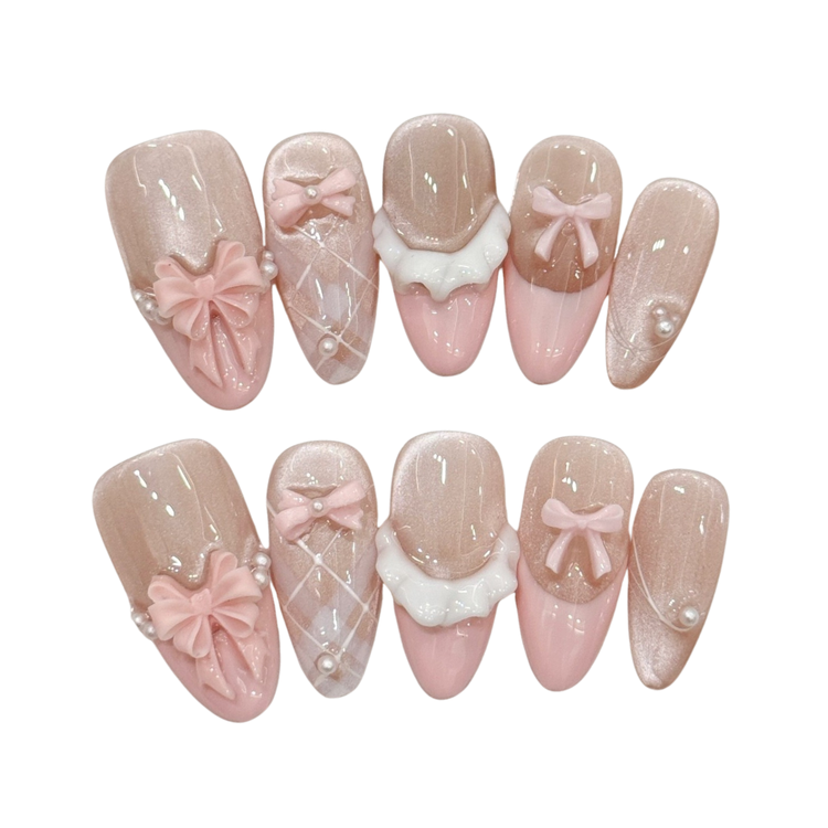 Soft pink and nude tones meet dainty bows and pearl details in this ballerina-inspired design – delicate, graceful, and full of charm