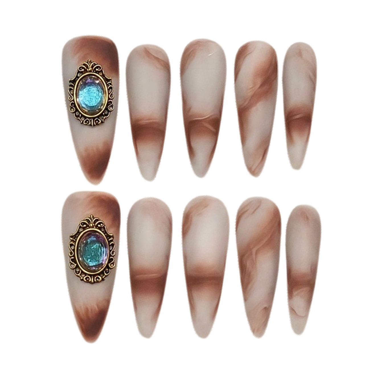 A smoky matte swirl in creamy beige and chocolate tones, adorned with a vintage-style metallic medallion and iridescent blue gem. A regal, moody set with antique flair