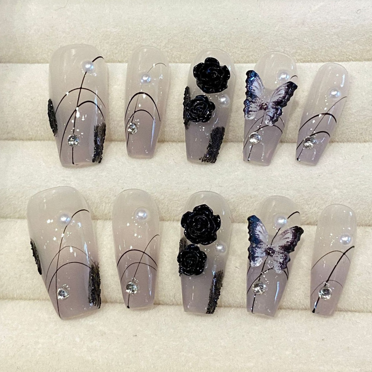 Elegant with a dark twist - these nails blend gothic florals and delicate pearls for romantic evenings or dramatic events