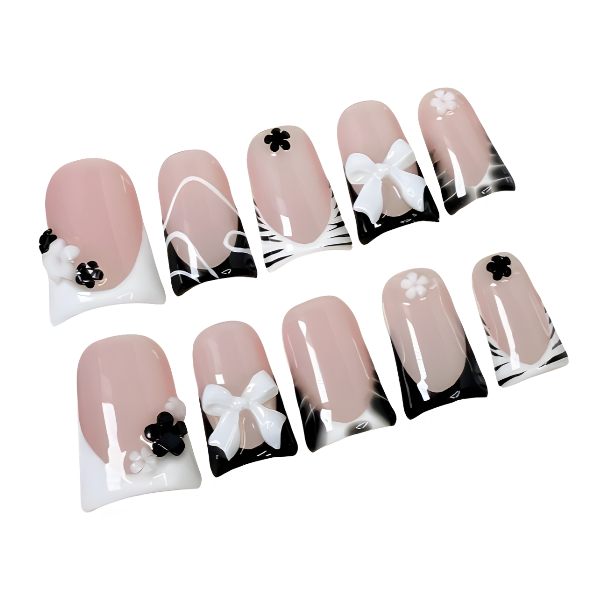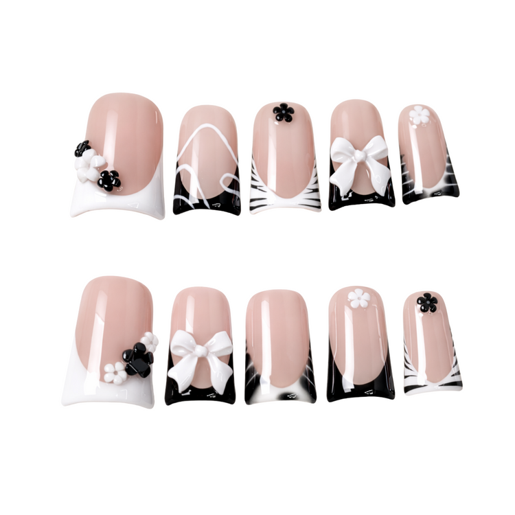 Chic short nails in a French black and white tuxedo theme, featuring zebra stripes, elegant bows, and 3D floral accents. A bold bridal look for the modern fashion-forward bride