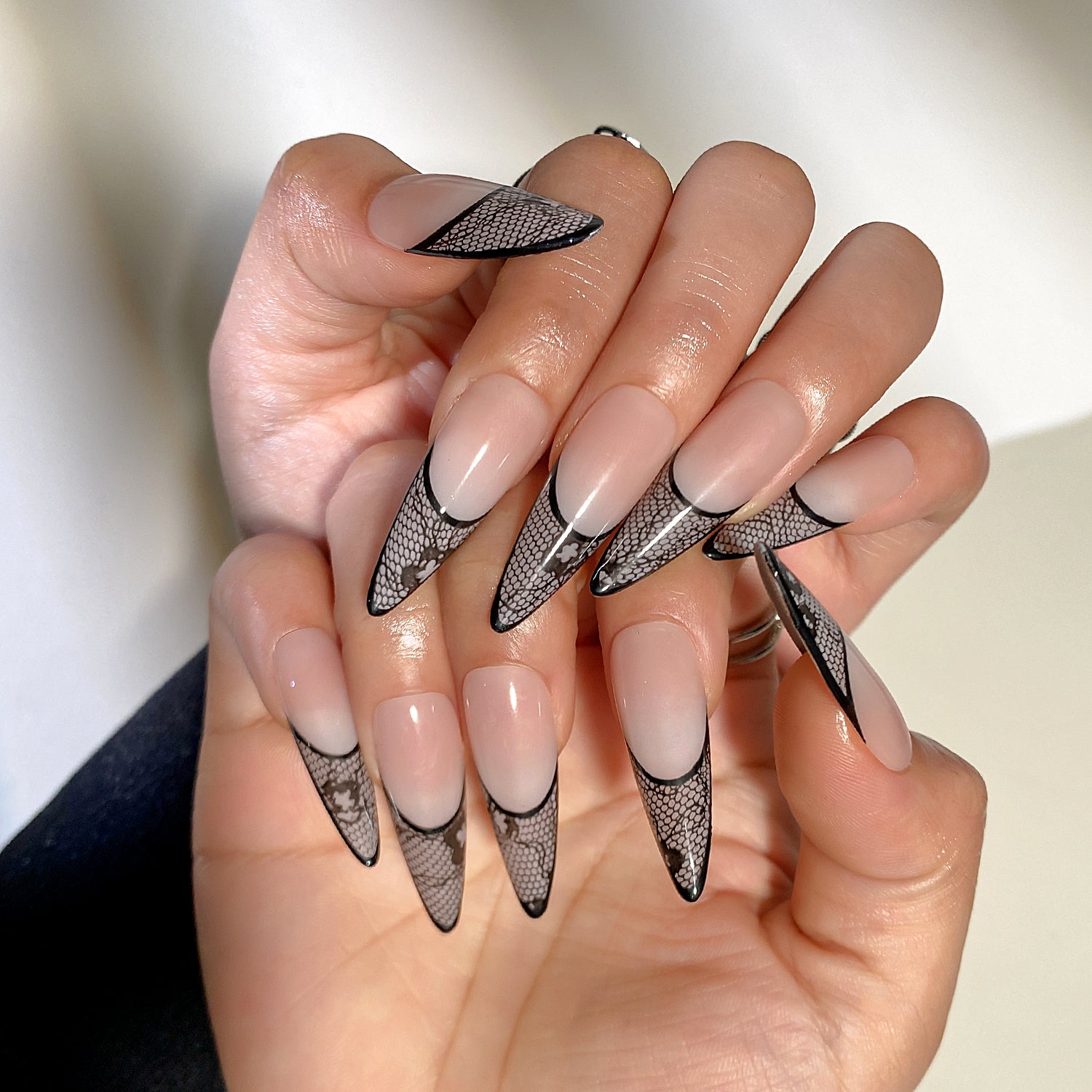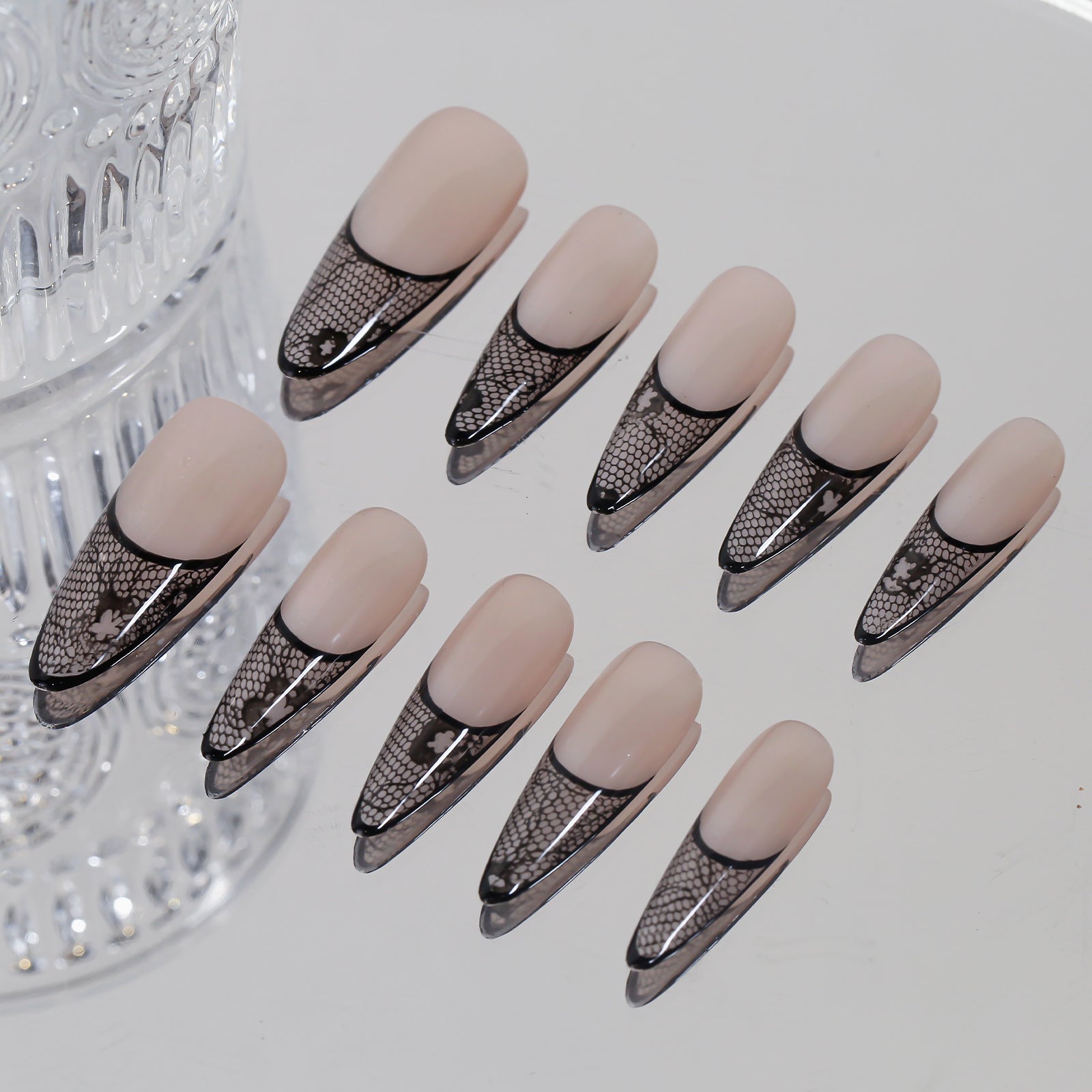 A refined design combining soft skin-tone shade with a sheer black lace effect.