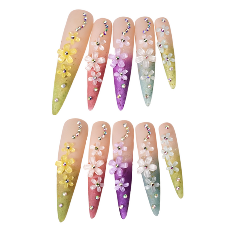 A blooming ombré of pastel gradients, adorned with 3D flowers and sparkling crystals – like springtime on your fingertips