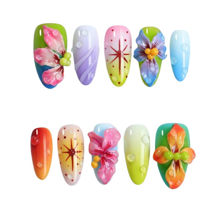 A vibrant celebration of springtime with bold 3D floral accents, glossy details, and playful drops for a lively, artistic look. Perfect for those who love color and creativity.