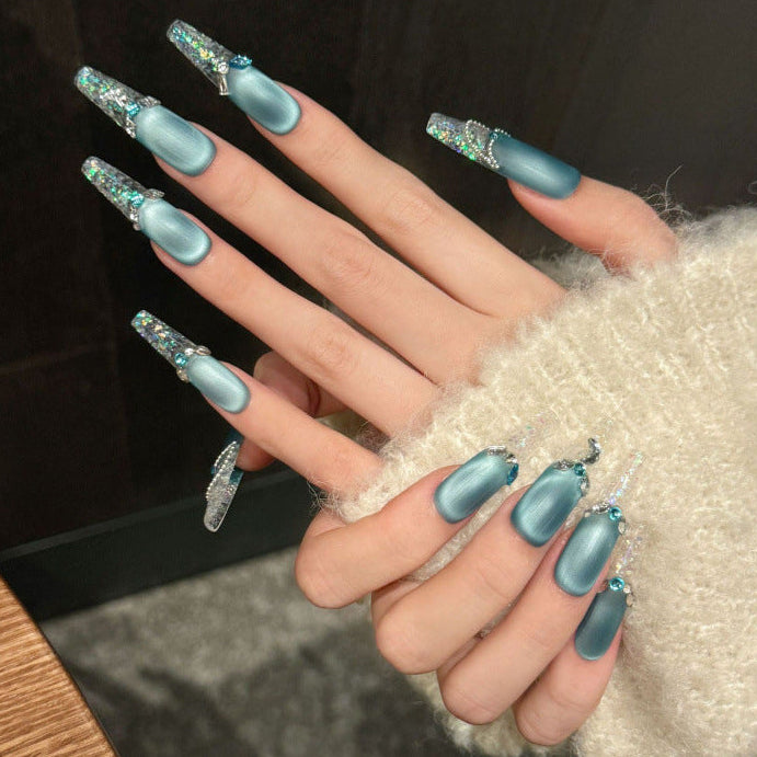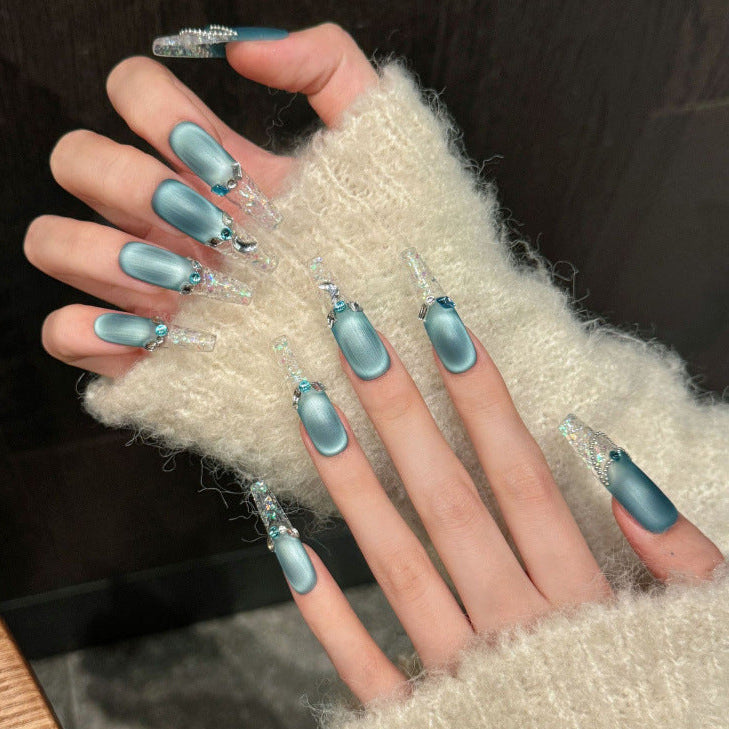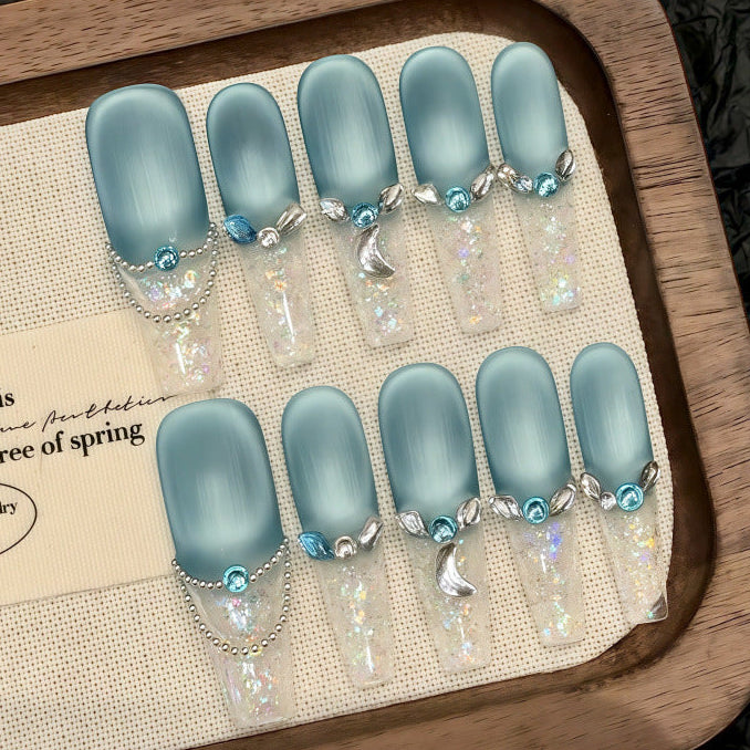 Icy blue matte nails paired with sparkling crystal accents and clear tips, creating a frosty, elegant glow reminiscent of winter’s charm.