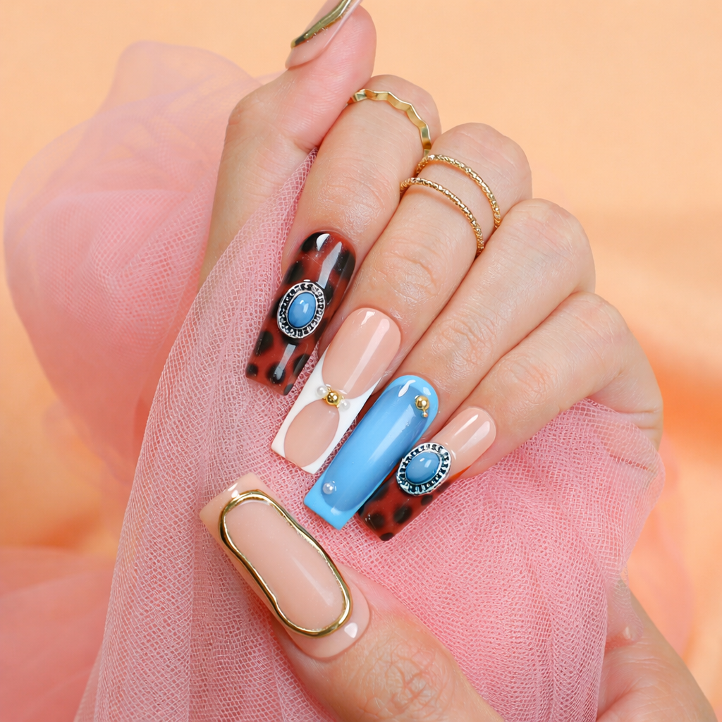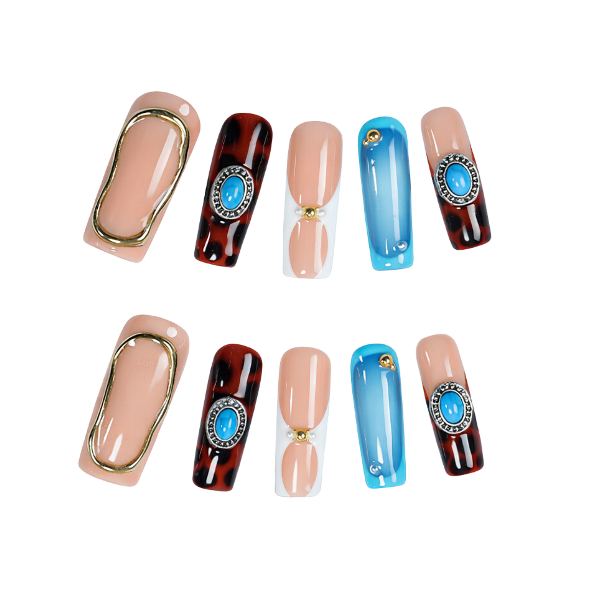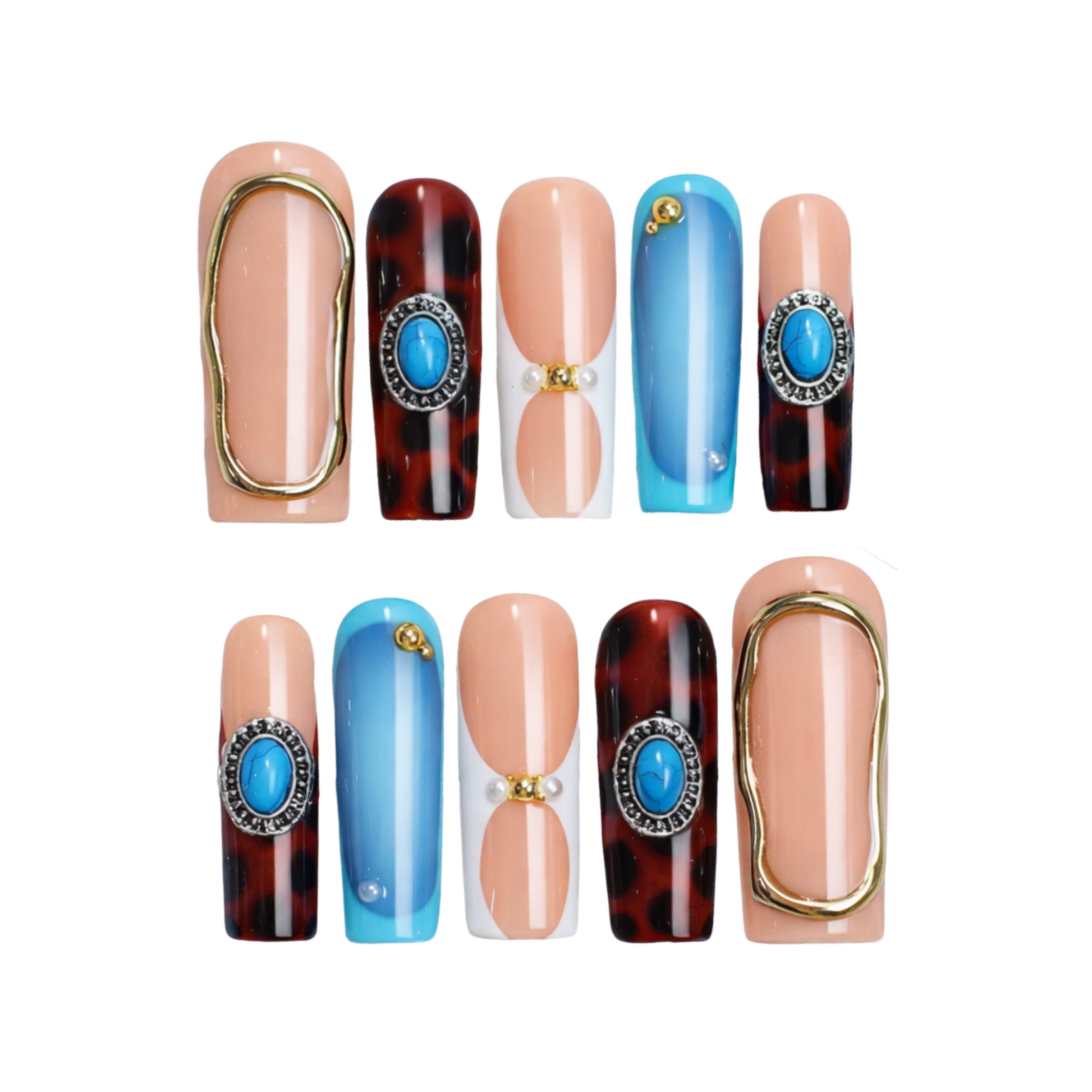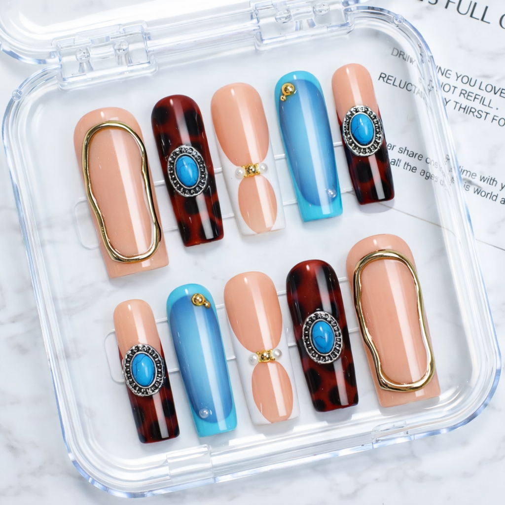 A refined mix of skin tone, deep brown, and blue ombré nails, adorned with turquoise gemstone medallions and golden accents - a luxurious design with a vintage royal touch.