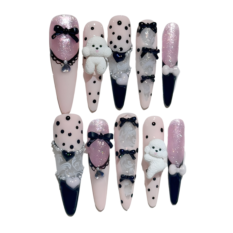 Chic pink-and-black nails with glitter, lace details, bows, and 3D poodles - a glamorous design that channels Parisian elegance with a playful twist.