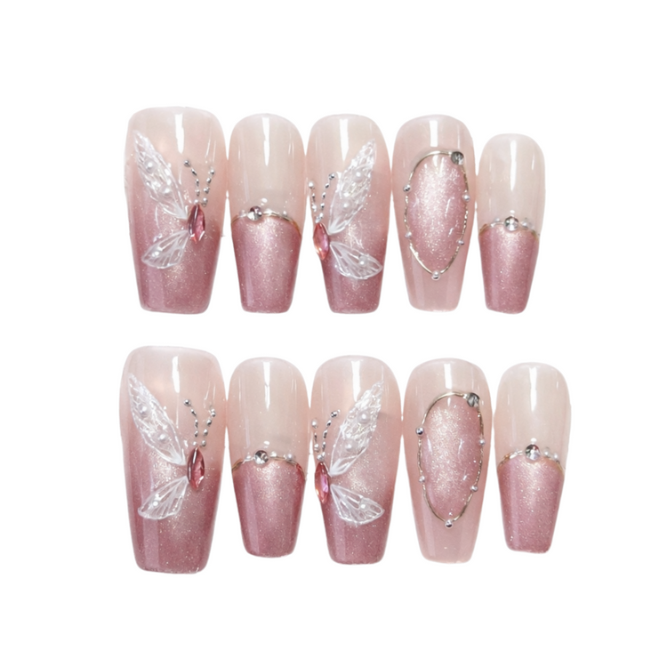 Soft blush pink nails with shimmering accents, delicate silver chains, and ethereal wing-like details for a dreamy, fairy-tale charm