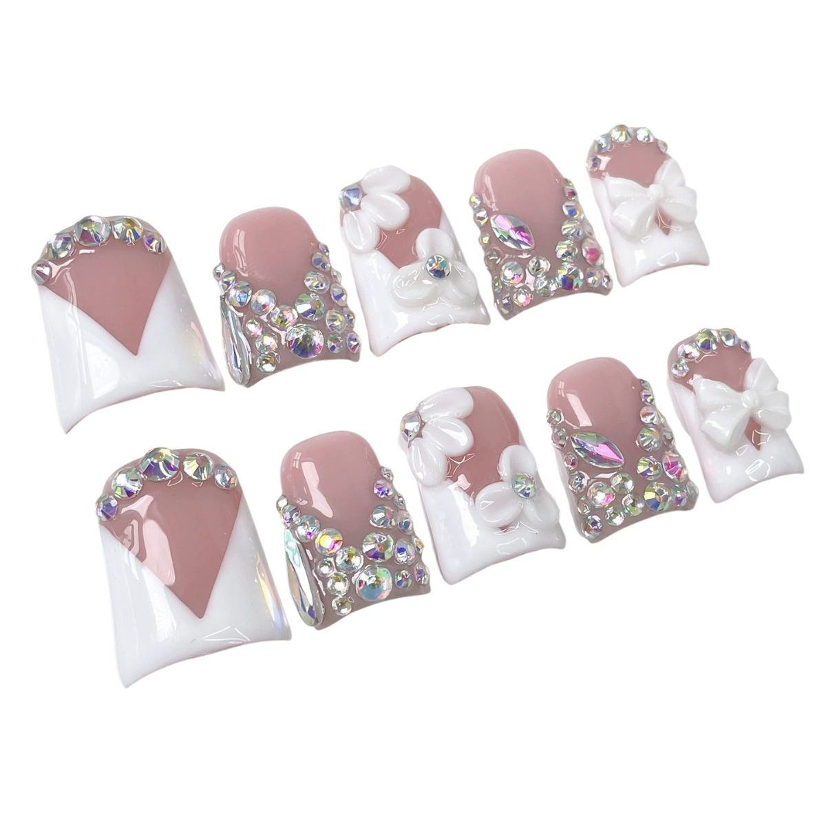 Elegant blush and white nails adorned with sparkling crystals, delicate 3D flowers, and bows - the perfect blend of romance and luxury.