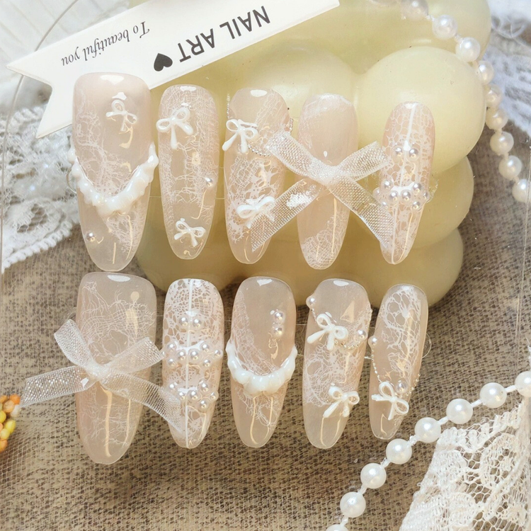 Sheer nude base adorned with delicate lace patterns, tiny satin bows, and pearl accents - a romantic design that captures the elegance of a bride’s veil.