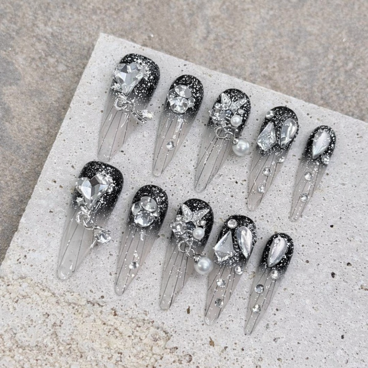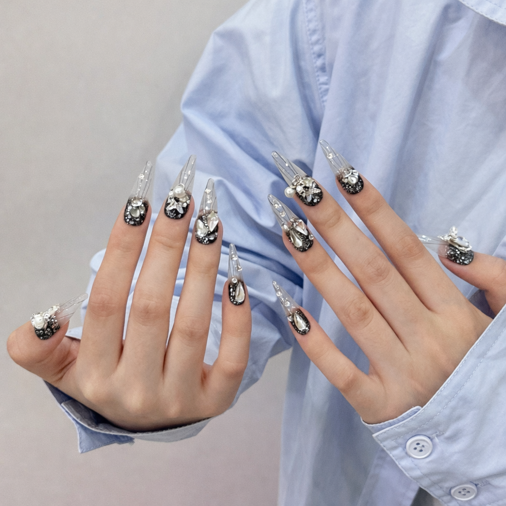 Designed for long statement nails, Brilliant features a crystal-clear base with sharp, light-catching facets and refined stone details. A high-impact design that reflects light from every angle and turns length into pure brilliance.