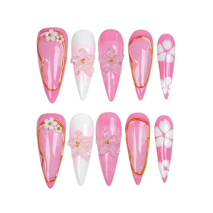 Bright pink nails with delicate white florals, 3D crystal blossoms, and golden accents - a playful yet elegant spring vibe.