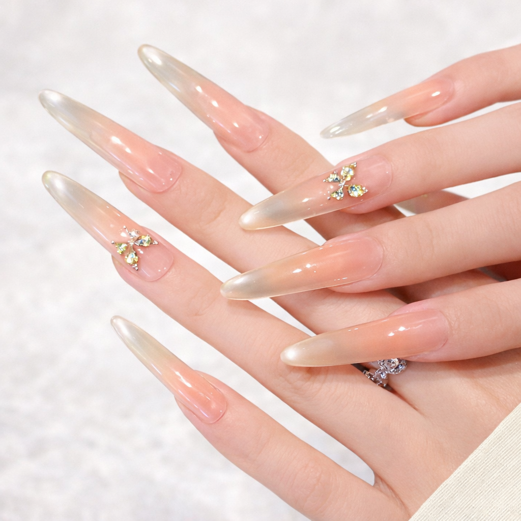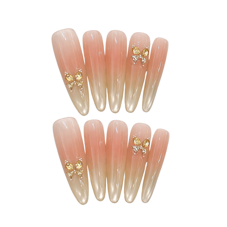 Blush-to-champagne ombré finished with delicate gold butterfly accents and a soft pearlescent glow. Light, feminine, and refined small details that create a lasting impression.