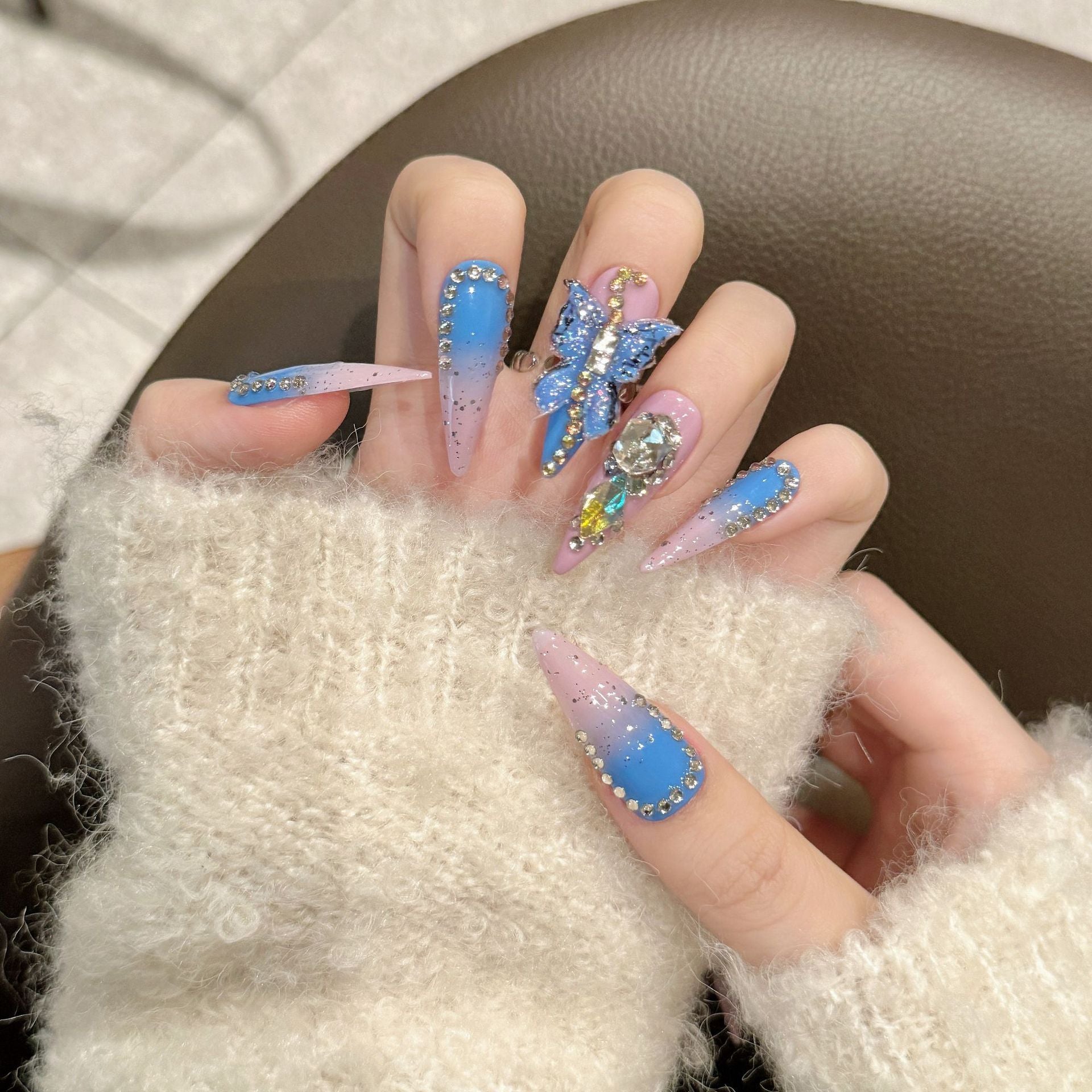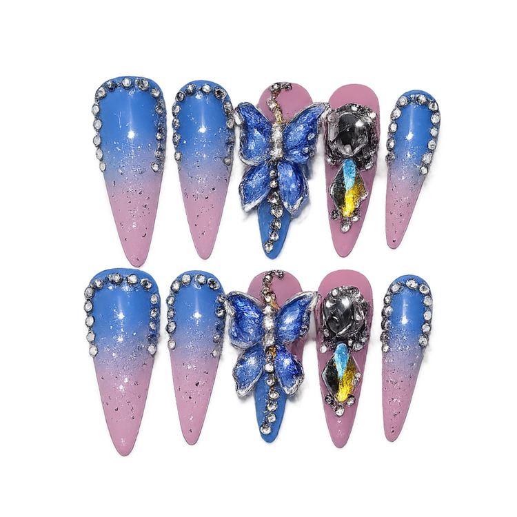 A soft blue-to-pink gradient accented with butterfly details, crystal edges, and subtle sparkle.
