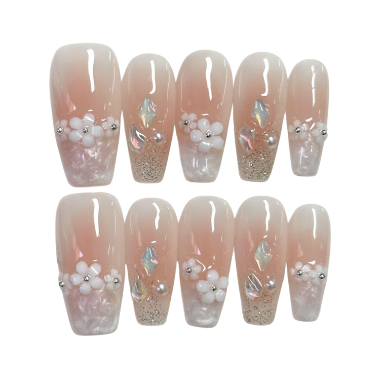 Soft nude ombré decorated with 3D floral accents, pearly beads, and shimmering crystals for a fresh, feminine glow.