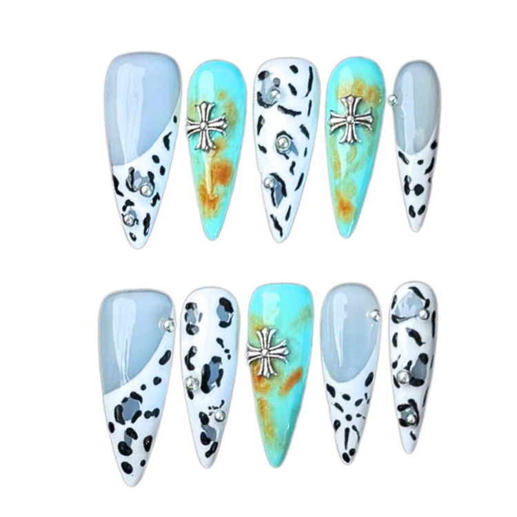 Bold almond stiletto nails blending turquoise gradients, dalmatian-inspired cheetah spots, and metallic cross charms, creating a wild yet elegant statement.