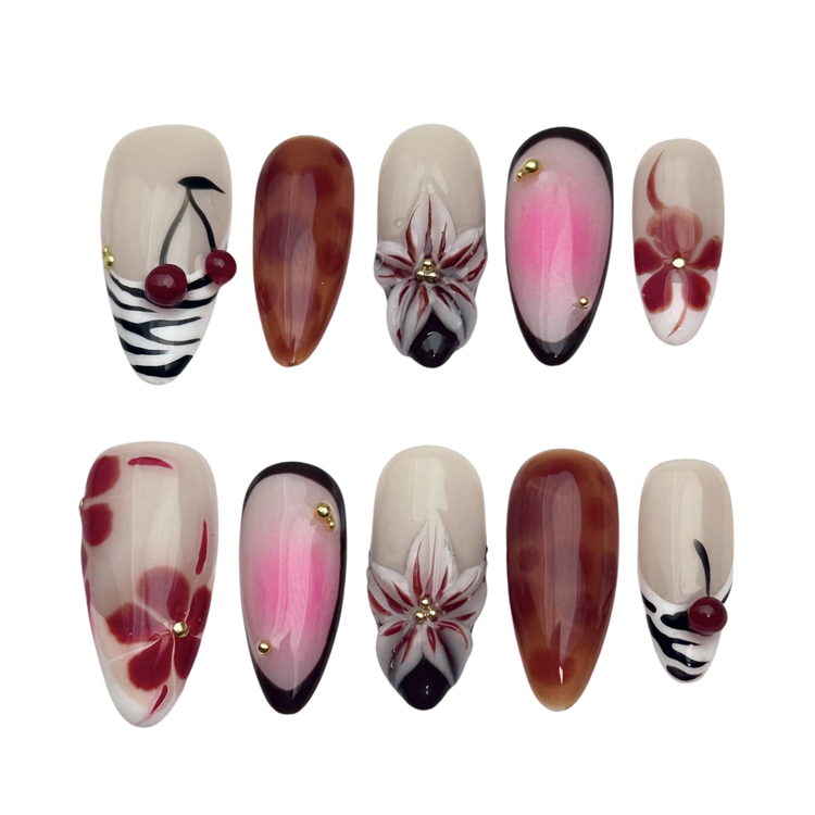 A graceful blend of wild zebra and tortoiseshell accents, softened by hand-painted florals and cherry details - capturing the untamed beauty of the savanna in full bloom.