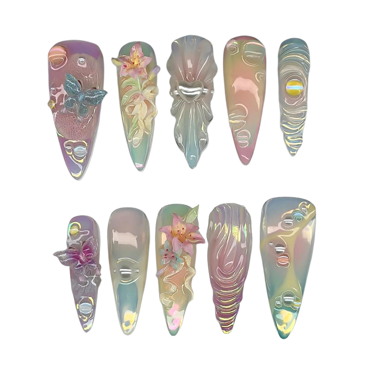 Description: An enchanting fusion of pastel iridescence and delicate blossoms, glowing like northern lights captured on your fingertips.