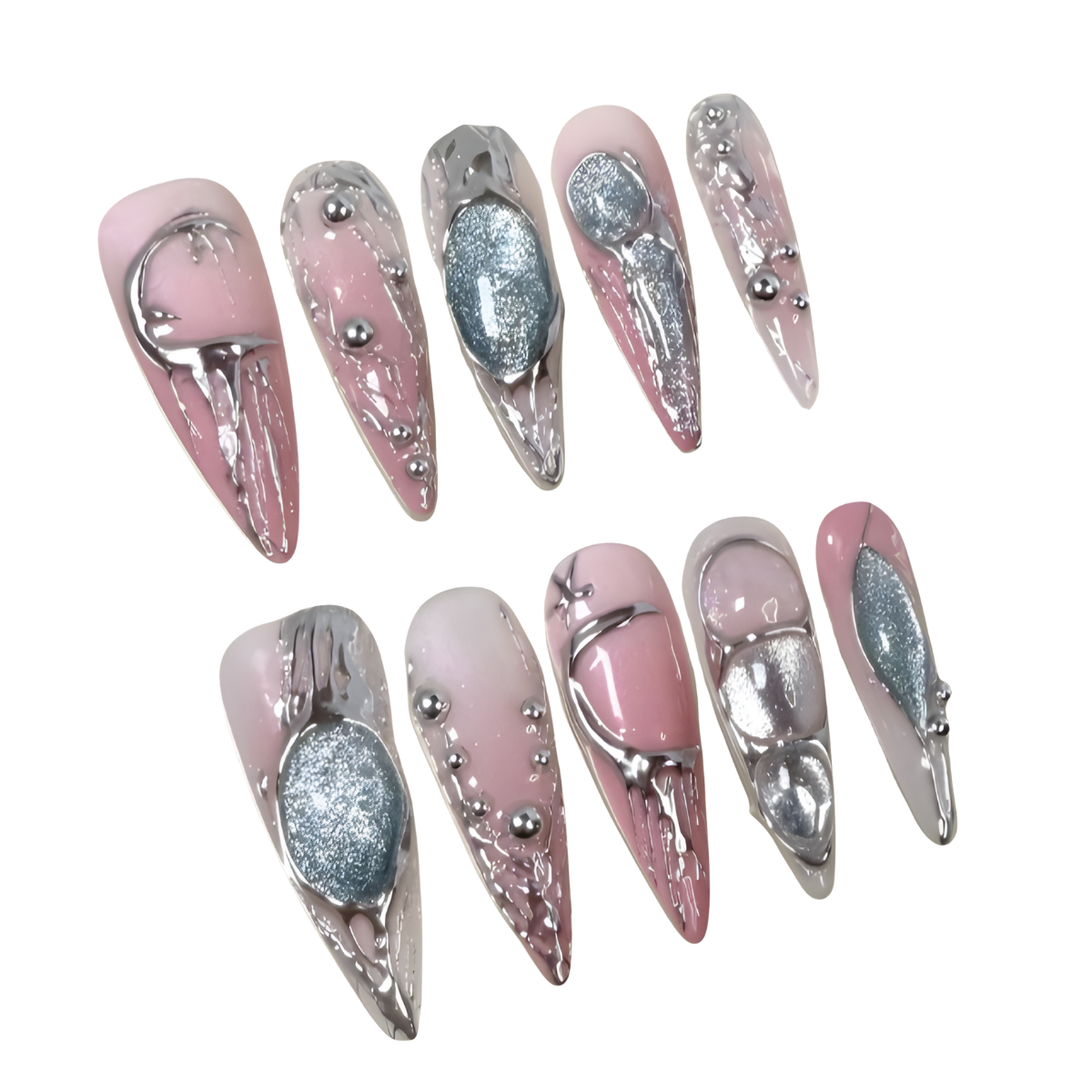 Perfect for fashion events or statement nights, this bold set blends pink gradients with galactic silver textures and raised chrome accents