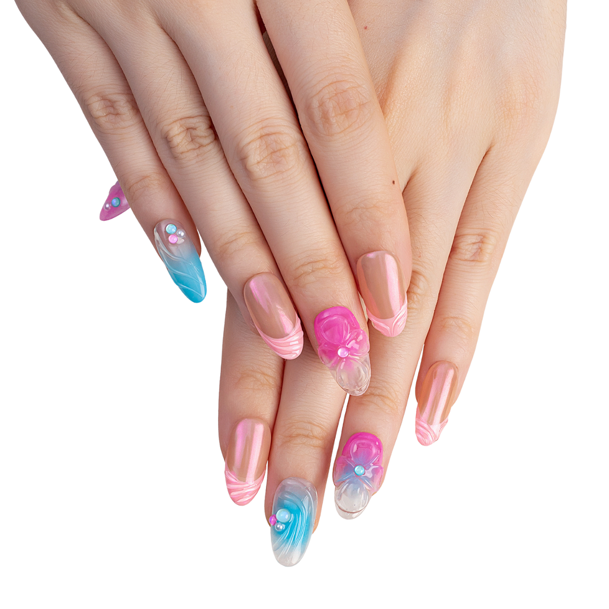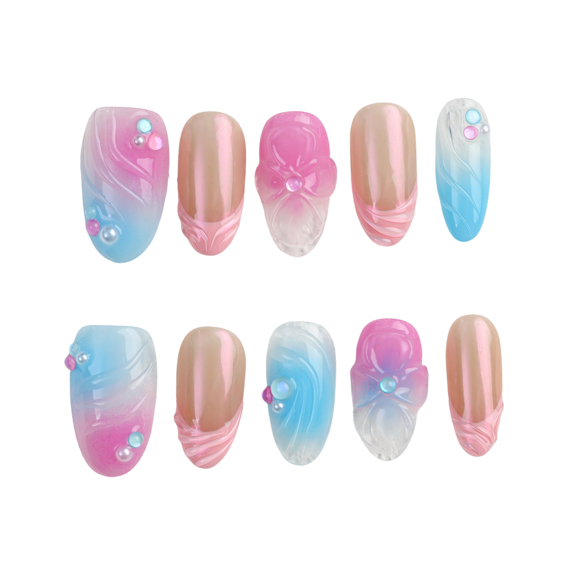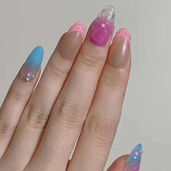 Soft swirls of pink, blue, and pearl shimmer blend like a dreamy sunset - a playful, airy design that feels as sweet and light as spun sugar in the clouds.