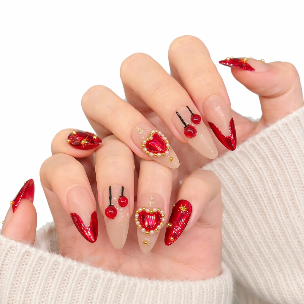 A bold Valentine design blending glossy blush tones with deep red accents, sculpted hearts, and golden details - playful, romantic, and impossible to ignore.