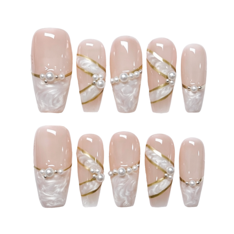 Elegant nude nails with marble white tips, gold-lined accents, and delicate pearl embellishments for a refined, bridal-inspired look.