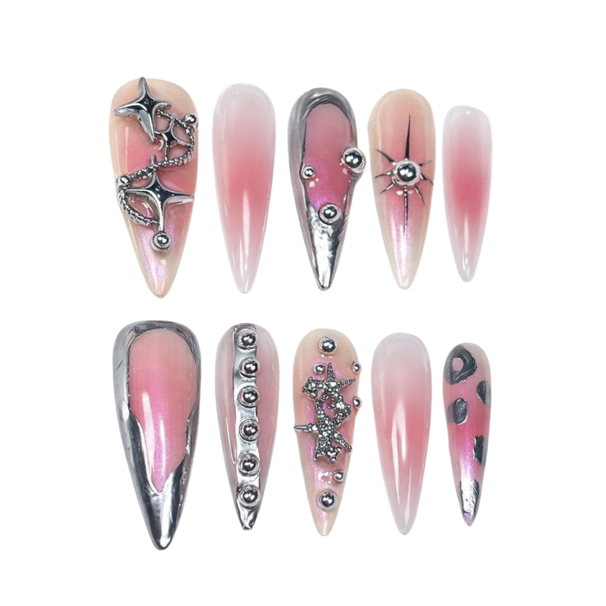 A futuristic pink ombré with chrome details and edgy studs – made to stand out at parties or festivals