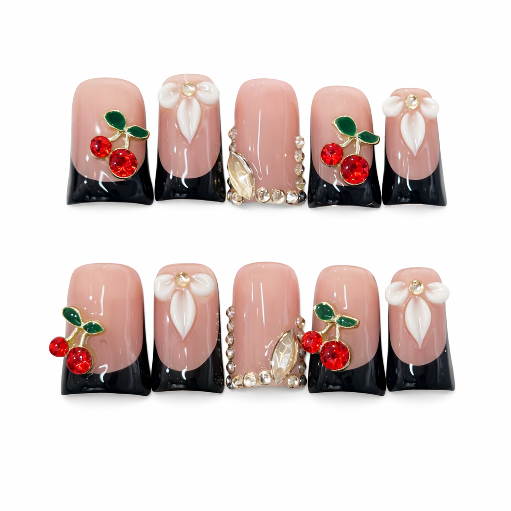 Playful meets edgy with glossy black tips, jeweled cherries, and delicate floral accents for a sweet yet bold vibe.
