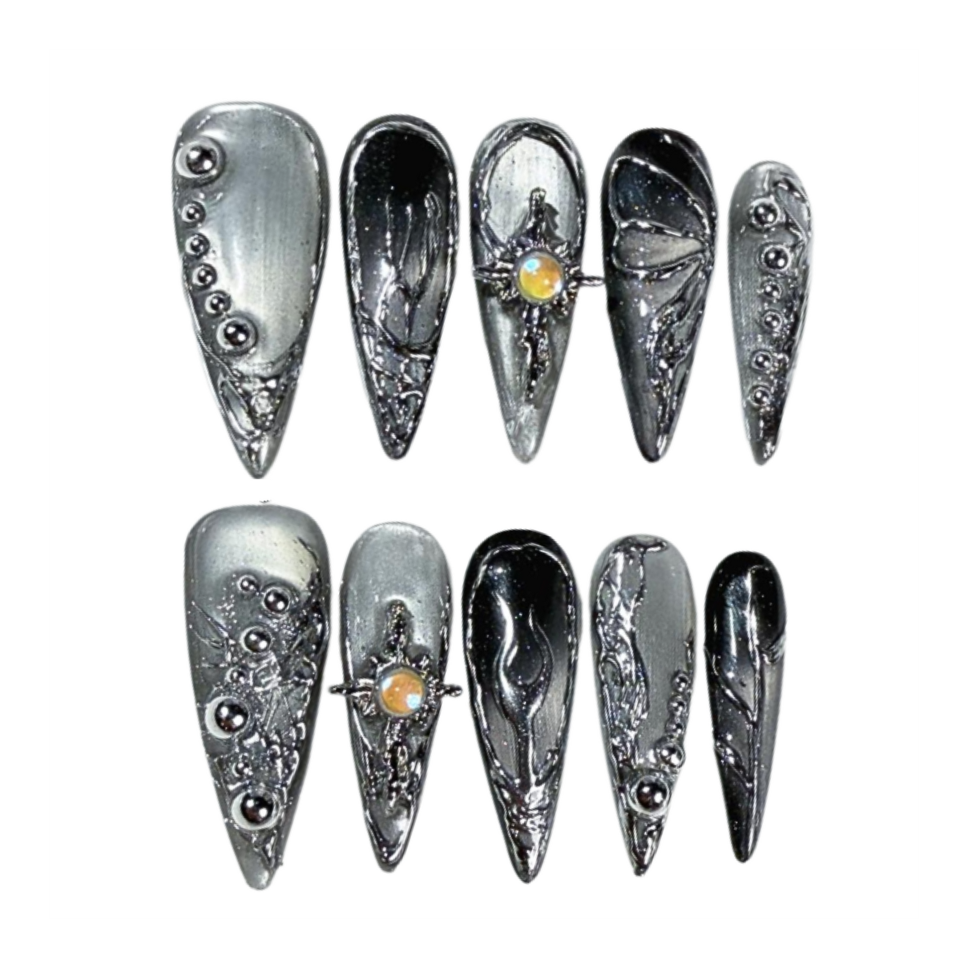 Sleek chrome nails with sculpted metallic textures and glowing stone accents.