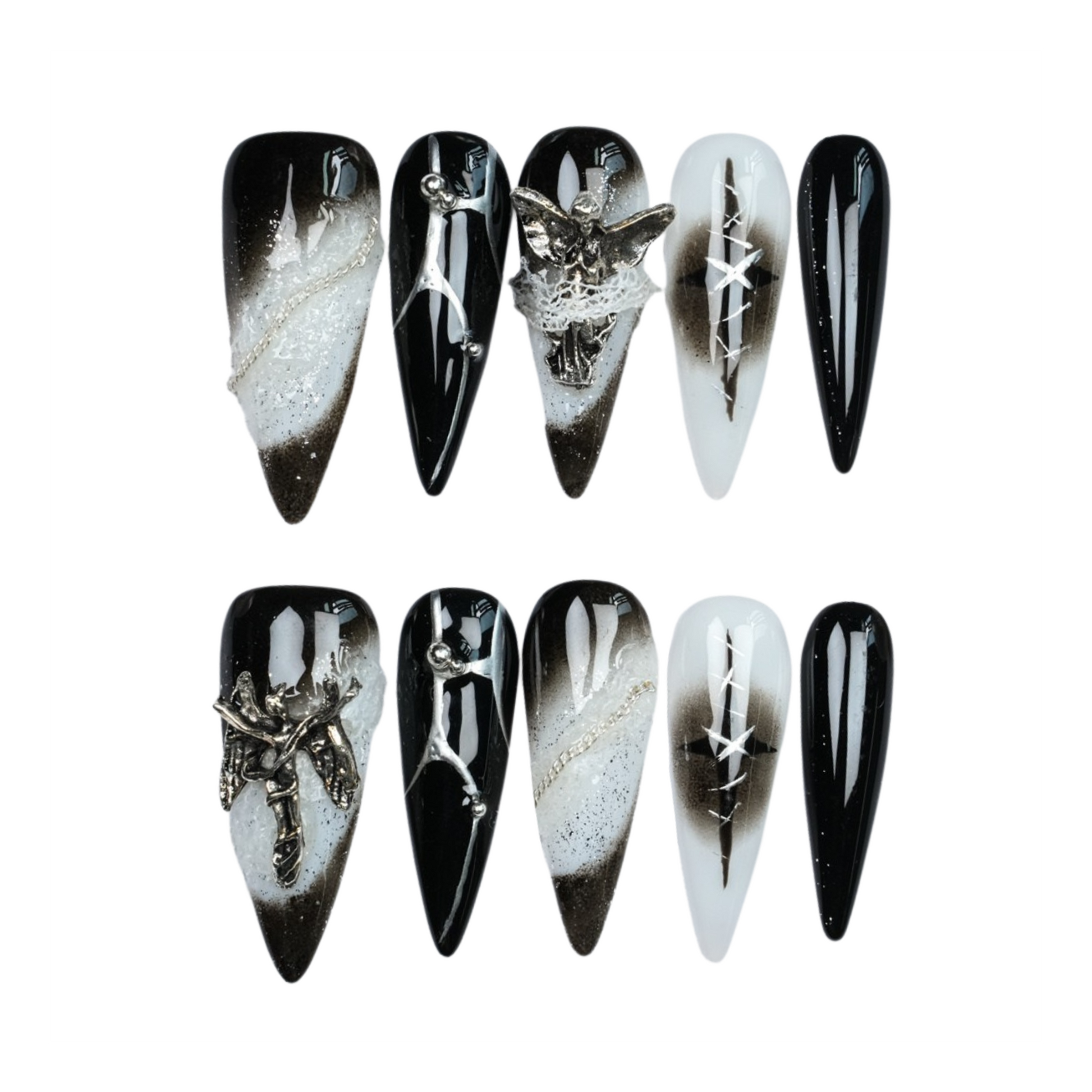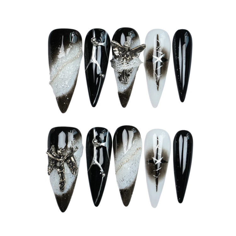 A bold and mysterious design blending deep black and icy silver tones, adorned with intricate gothic details.