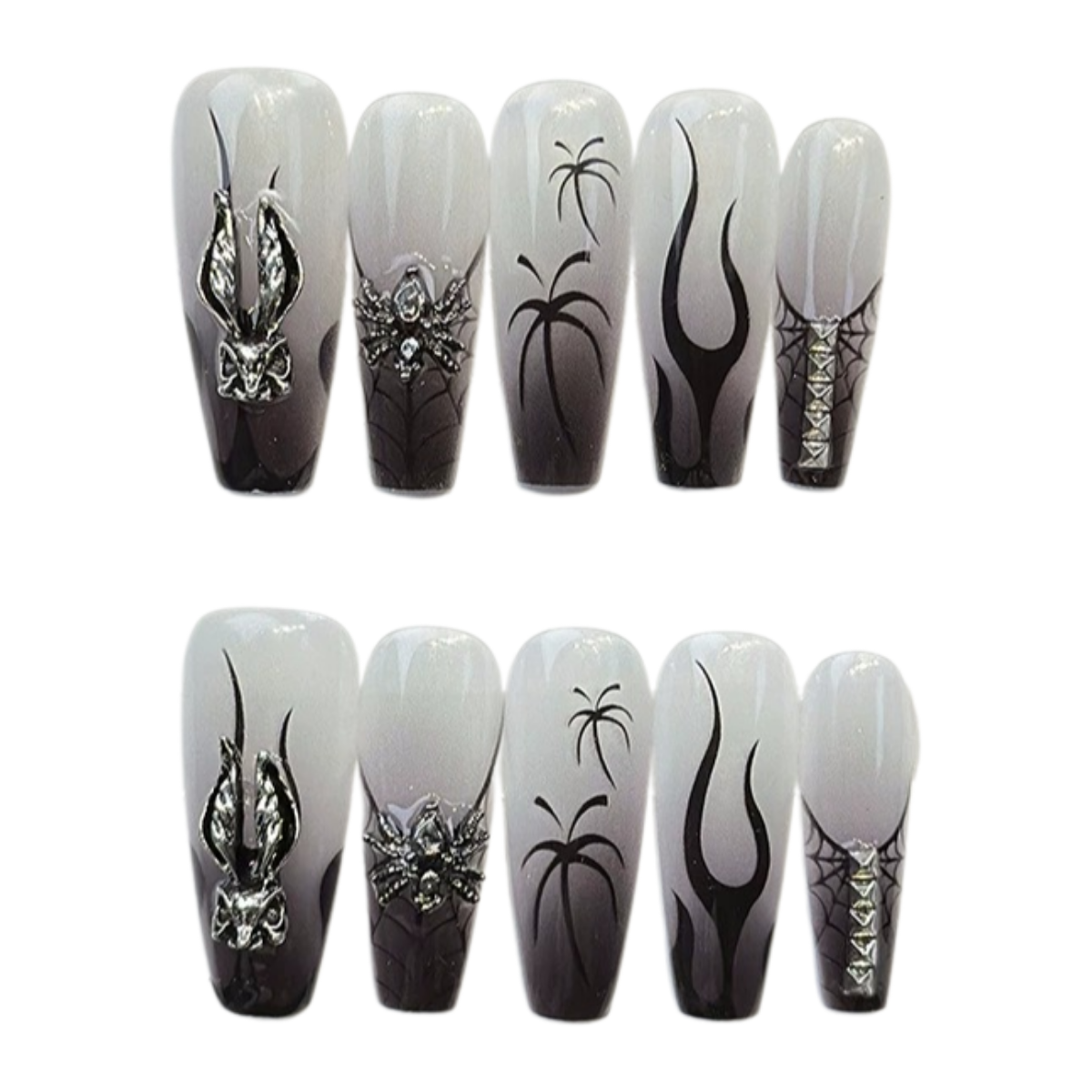Smoky grey-to-black ombré with high-gloss gel finish, accented by silver 3D charms and inky black artwork for a dramatic, gothic look.