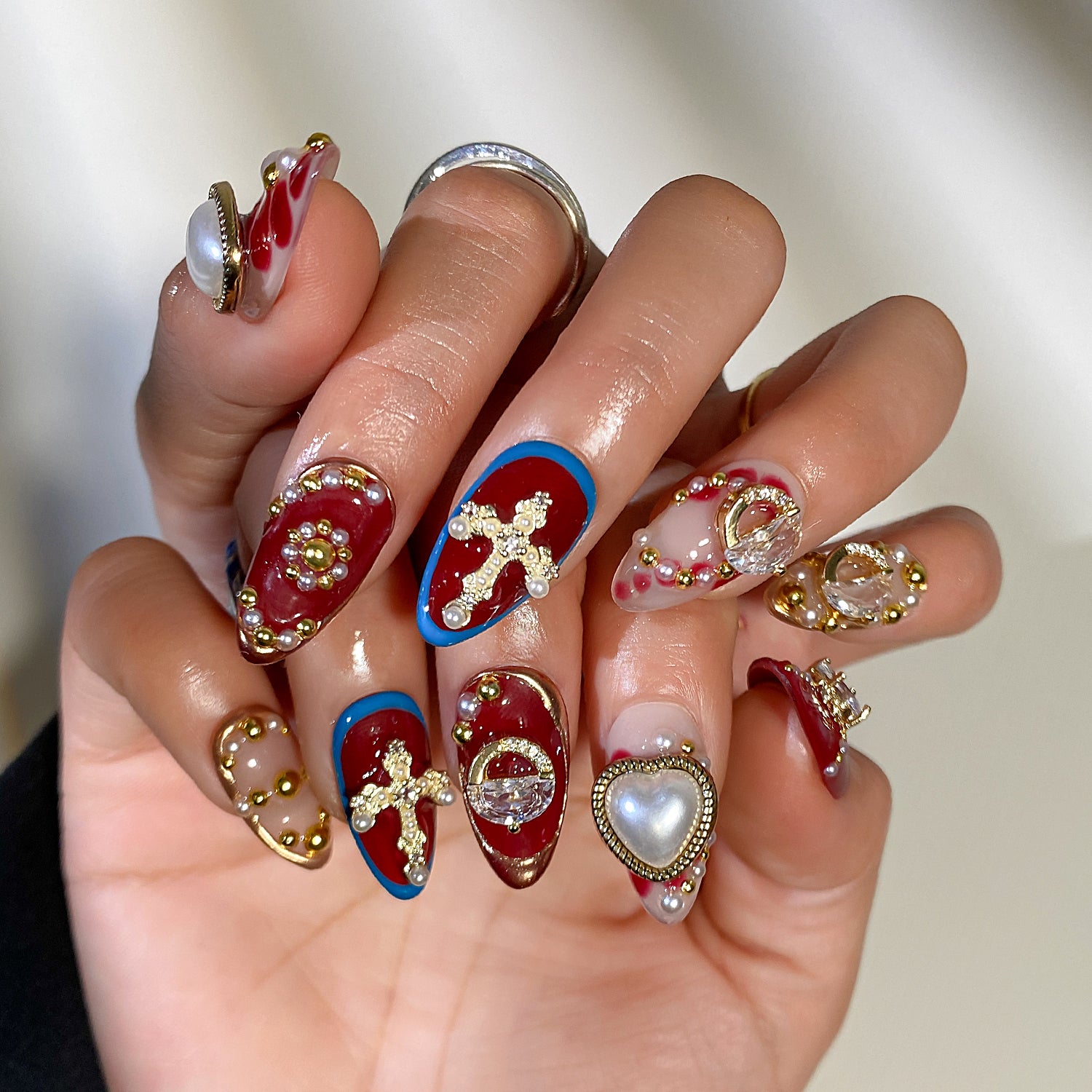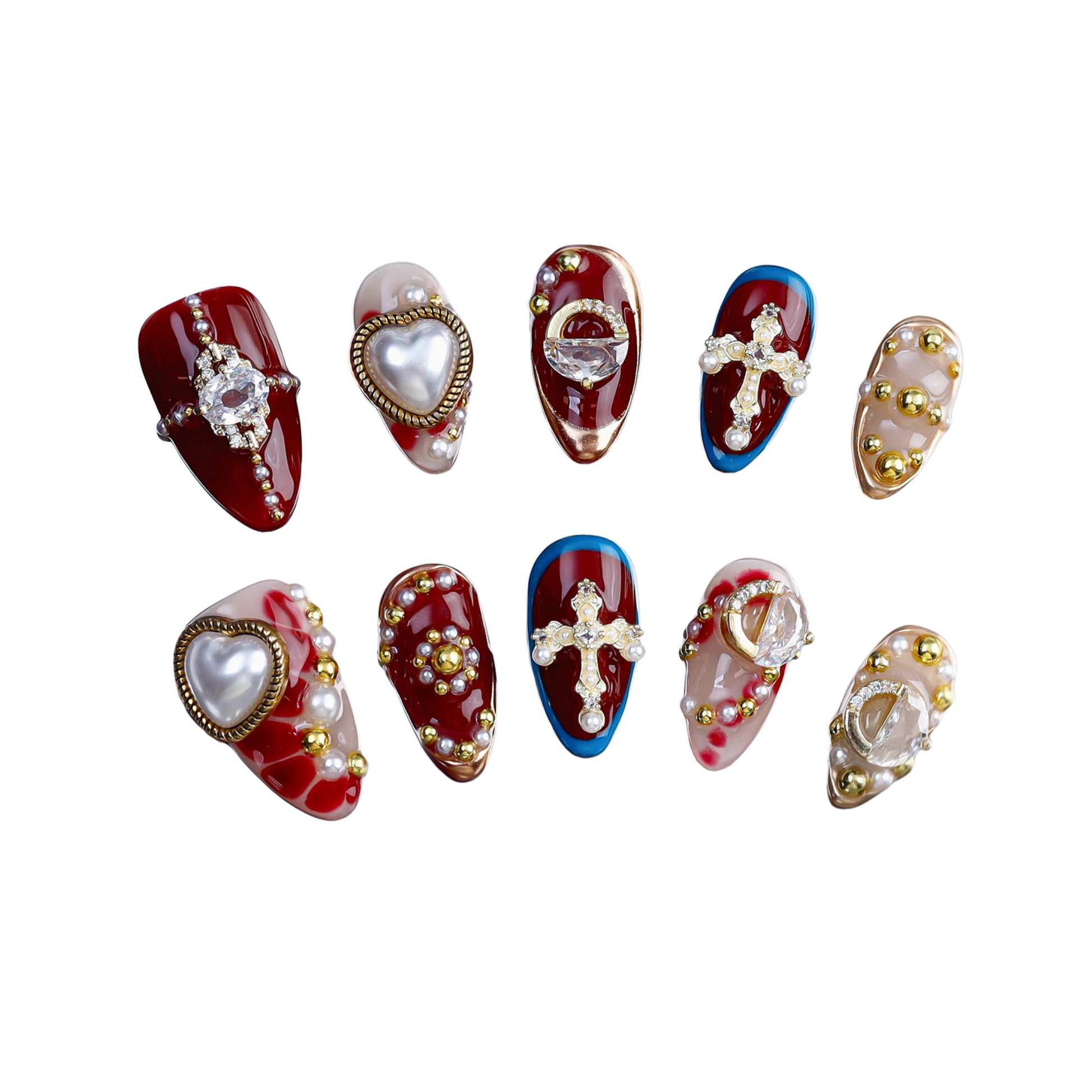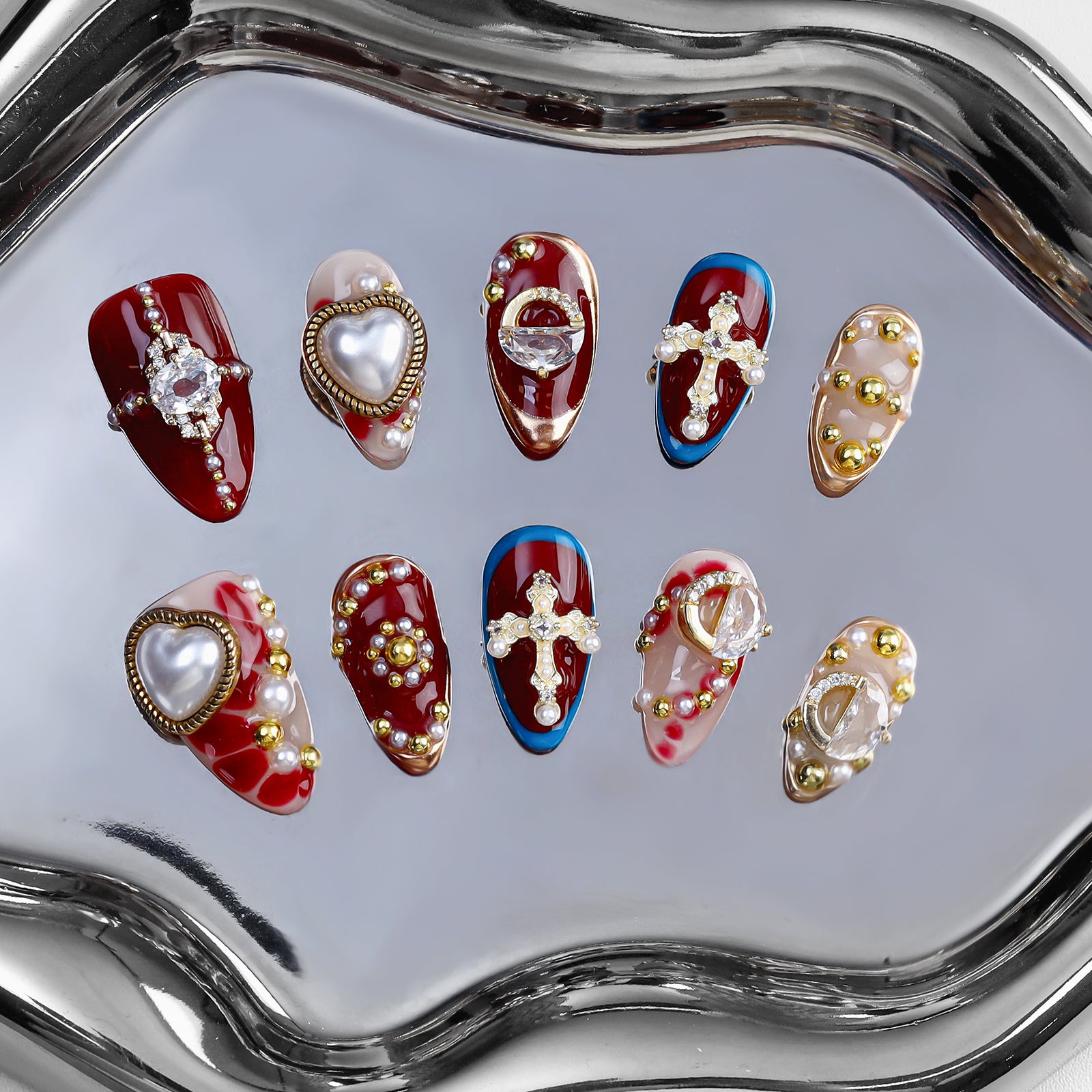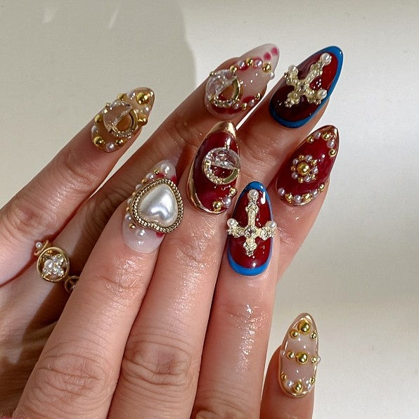A bold design featuring deep crimson tones, sculpted heart and cross details, and refined gold accents for a rich, dramatic statement.
