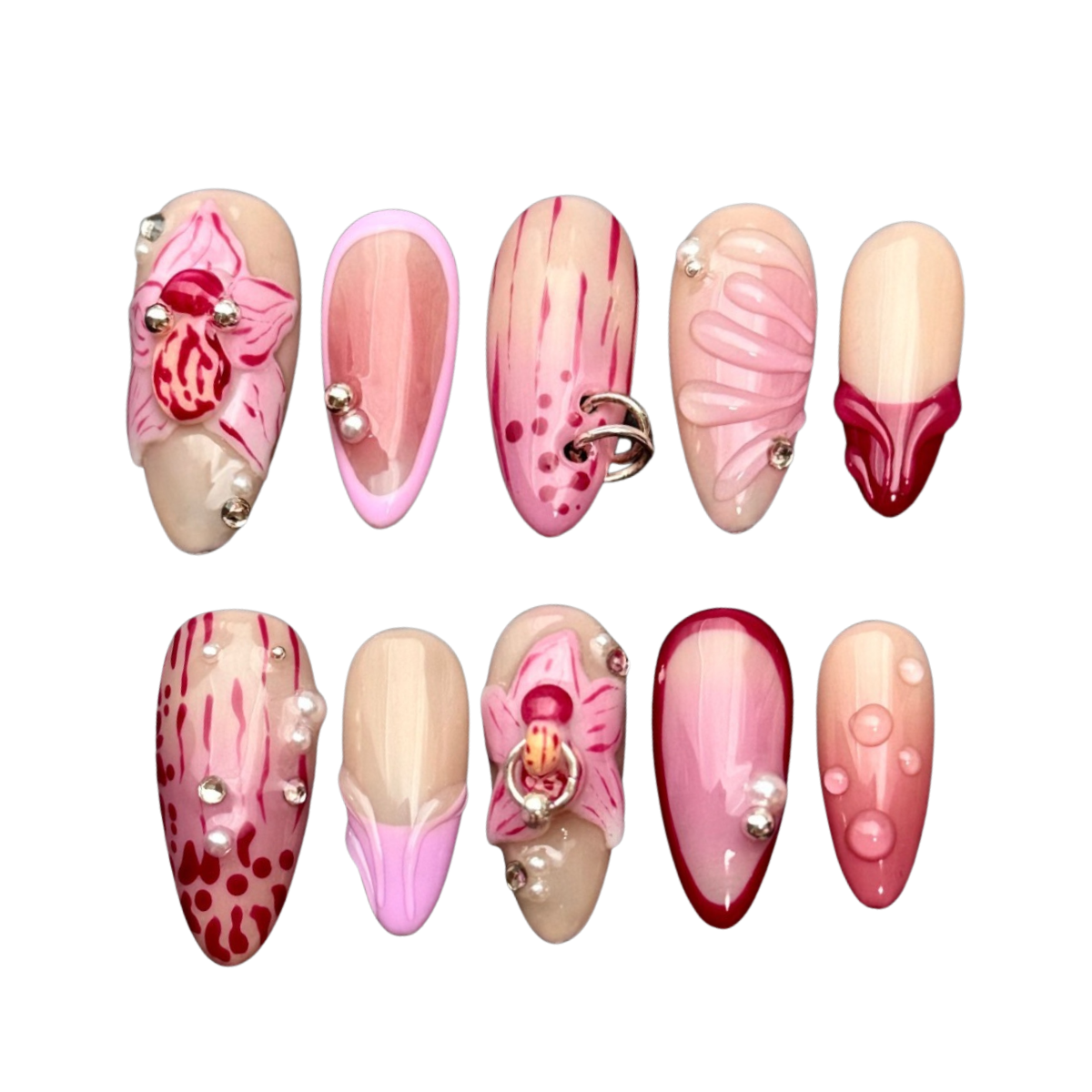 A striking mix of nude and bold pinks with 3D orchid flowers, gem studs, abstract drips, and edgy piercings for a fierce, artistic vibe.