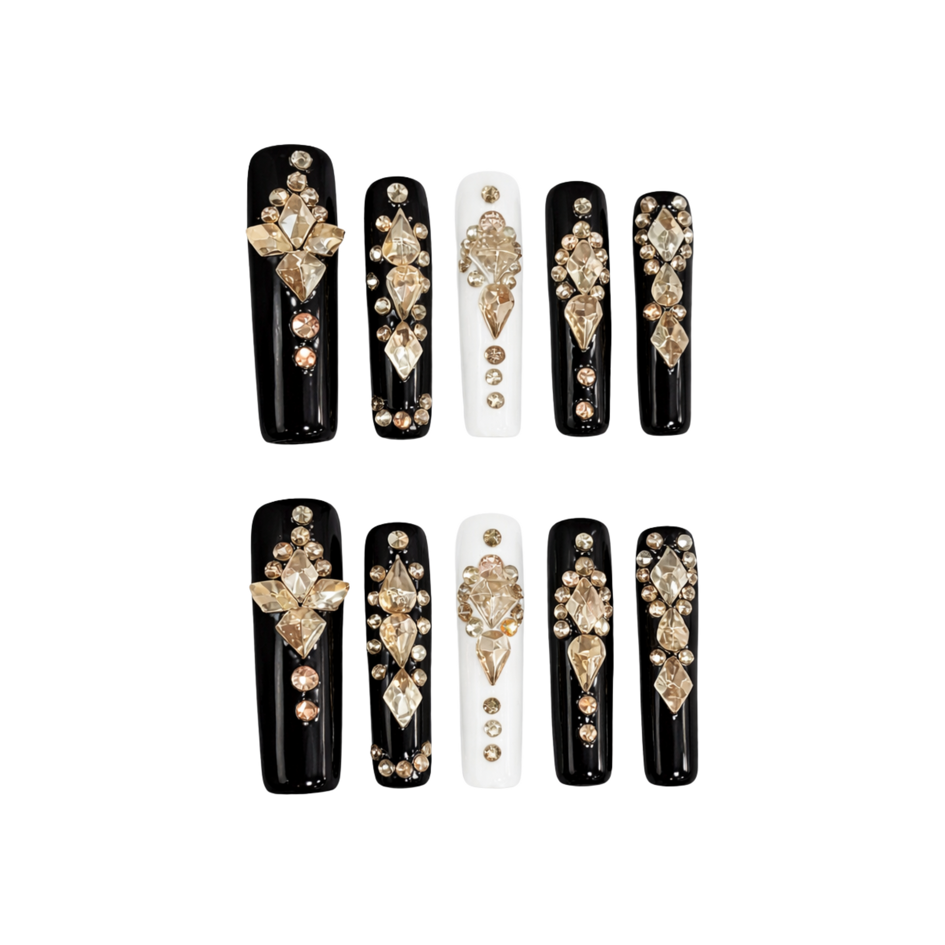 A bold black-and-white design elevated with gold-toned crystal embellishments and high-shine accents. Strong contrasts and sculpted details create a commanding presence luxurious, powerful, and designed to own every room.