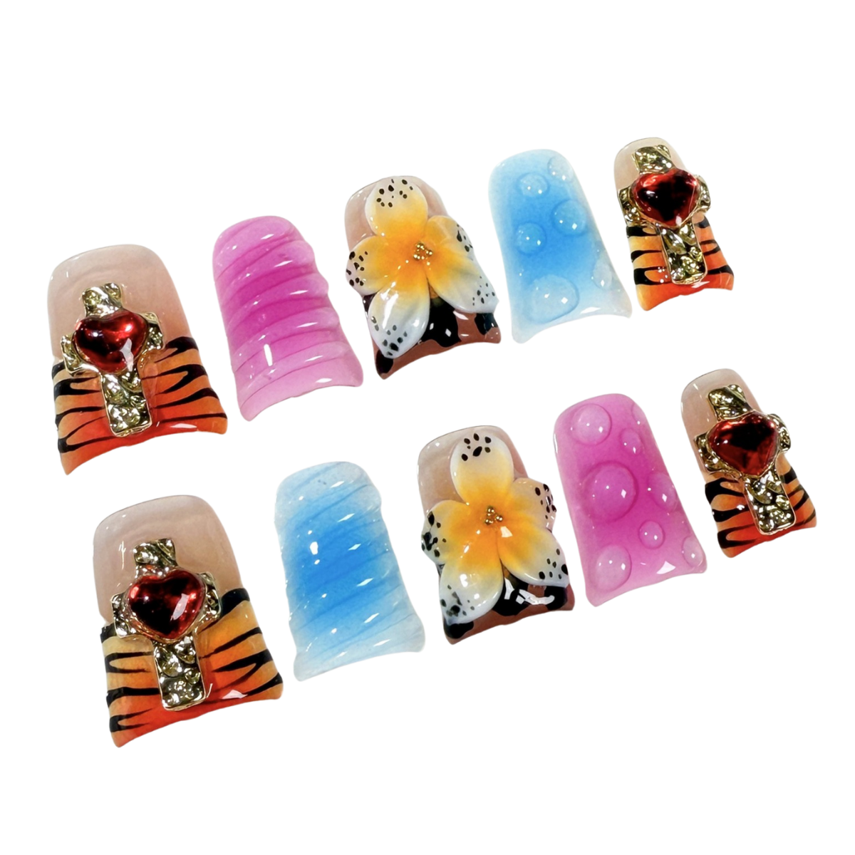 A bold fusion of tiger stripes with deep red heart gems, tropical floral accents, and playful pink and blue touches. Exotic, daring, and full of attitude.