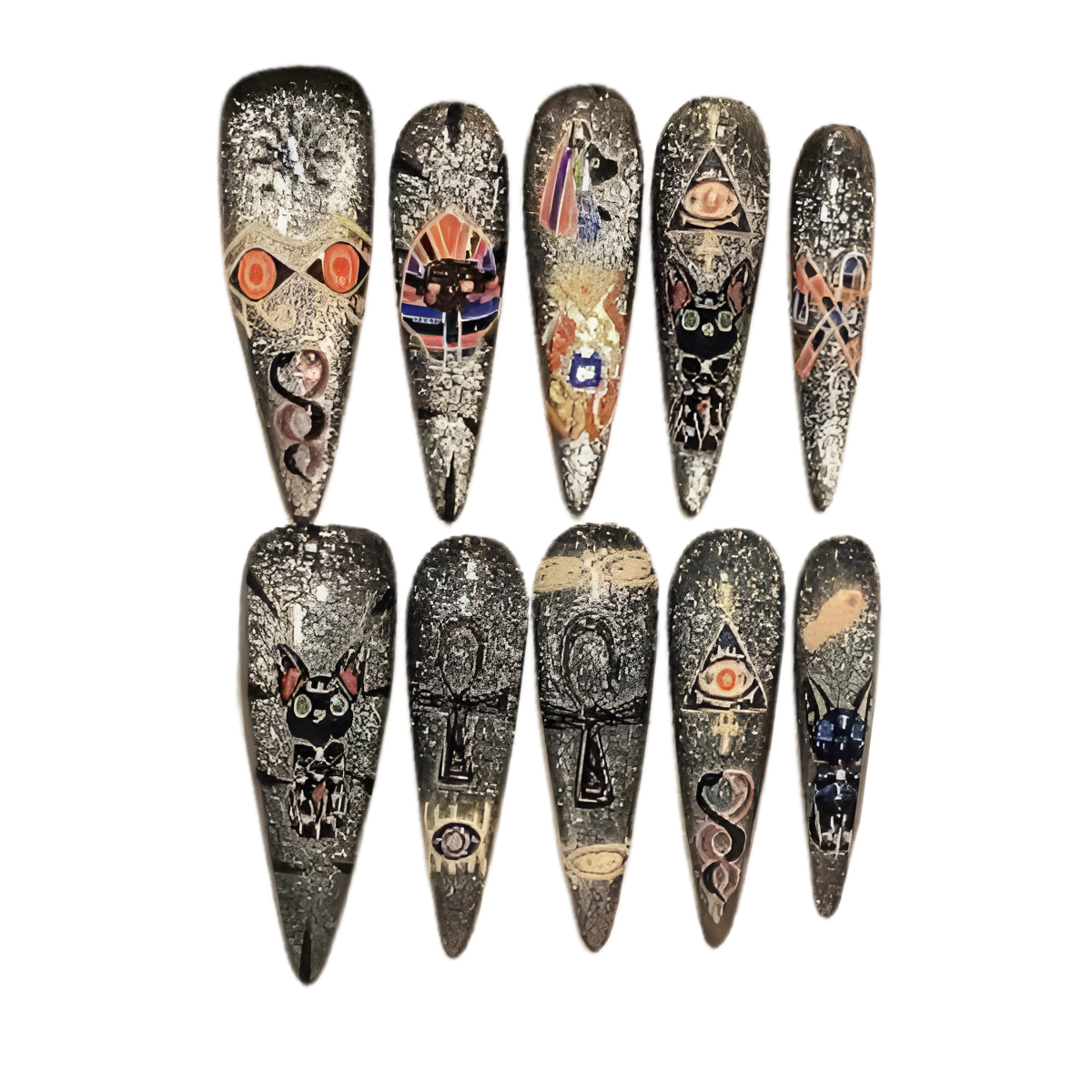Shimmering black nails with ancient Egyptian-inspired symbols – mystical eyes, celestial signs, and sacred motifs. A bold set for lovers of mystery and history