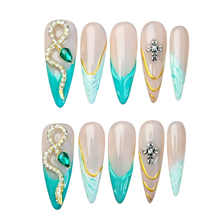A striking blend of Skin-tone base and emerald–turquoise tips, elevated with golden accents and crystal embellishments for a bold, glamorous edge.