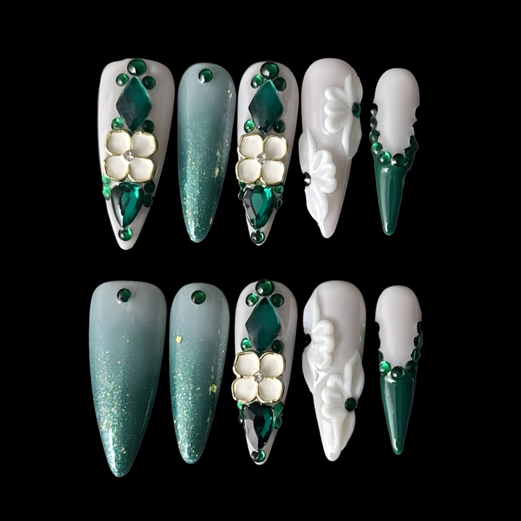 Deep emerald green blended with soft ivory, adorned with 3D florals and crystal gems - a luxurious ode to seasonal elegance.