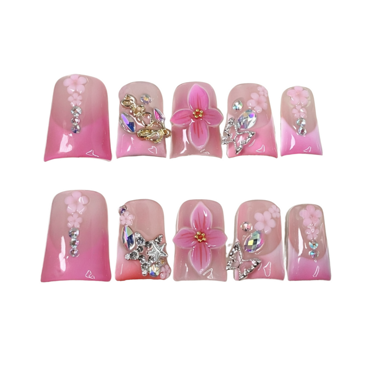 Romantic pink nails with 3D flowers, crystals, and silver accents for a soft yet radiant look.