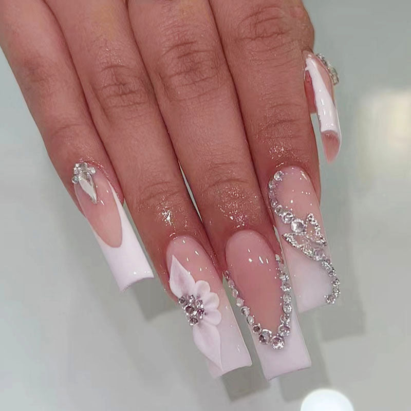 Elegant nude base with crisp white tips, adorned with 3D florals, crystal butterflies, and sparkling gems for a truly timeless bridal look.