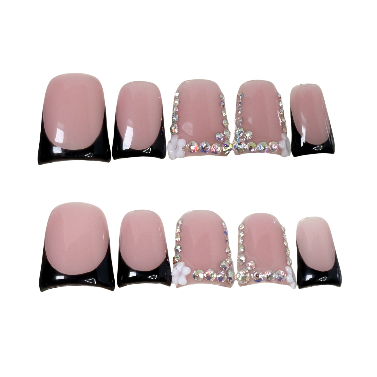 An elegant nude set with bold black French tips, adorned with sparkling rhinestones for a luxurious touch