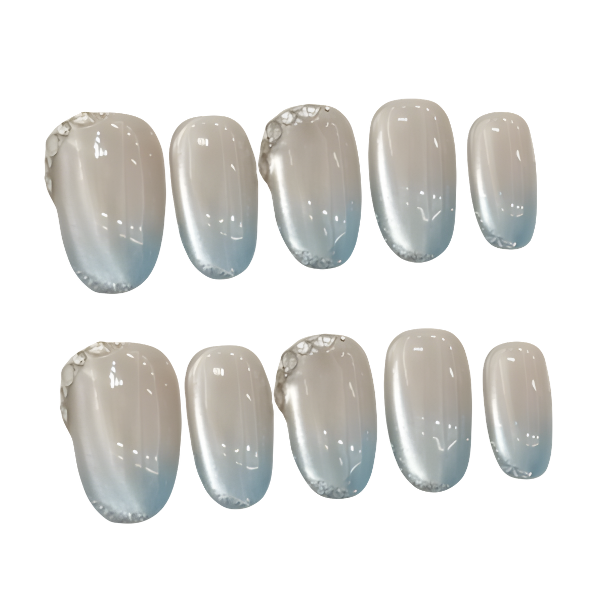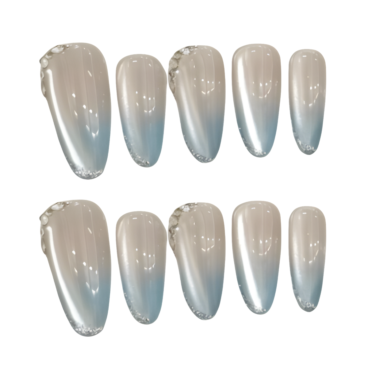 Elegant nude-to-ice-blue ombré with a hint of shimmer and crystal accents – perfect for a winter wedding or a frosty glam look
