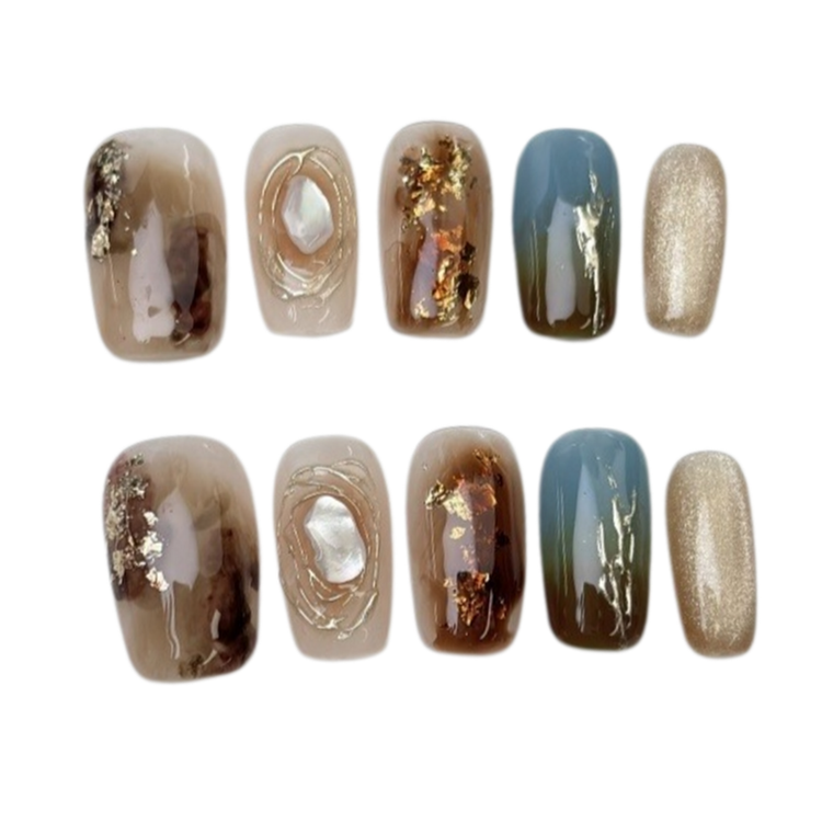 Earth-inspired blend of marble browns, ocean blues, and golden foils with natural shell accents - perfect for transitional seasons.